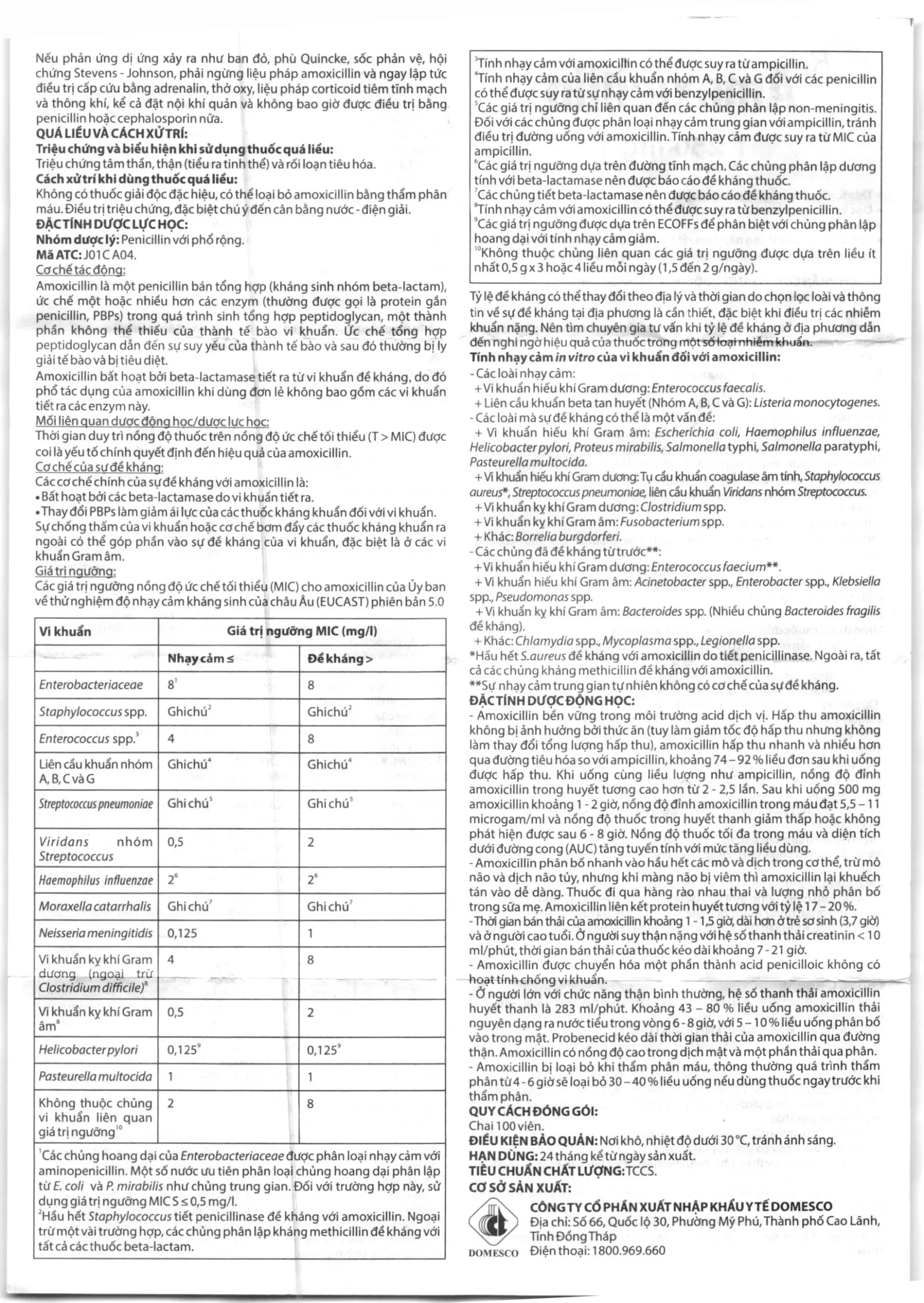 - Các giá trị ngưỡng nồng độ ức chế tối thiểu (MIC) cho Amoxicillin là của Ủy ban về Thử nghiệm độ nhạy cảm kháng sinh của Châu Âu (EUCAST) phiên bản 5.0.