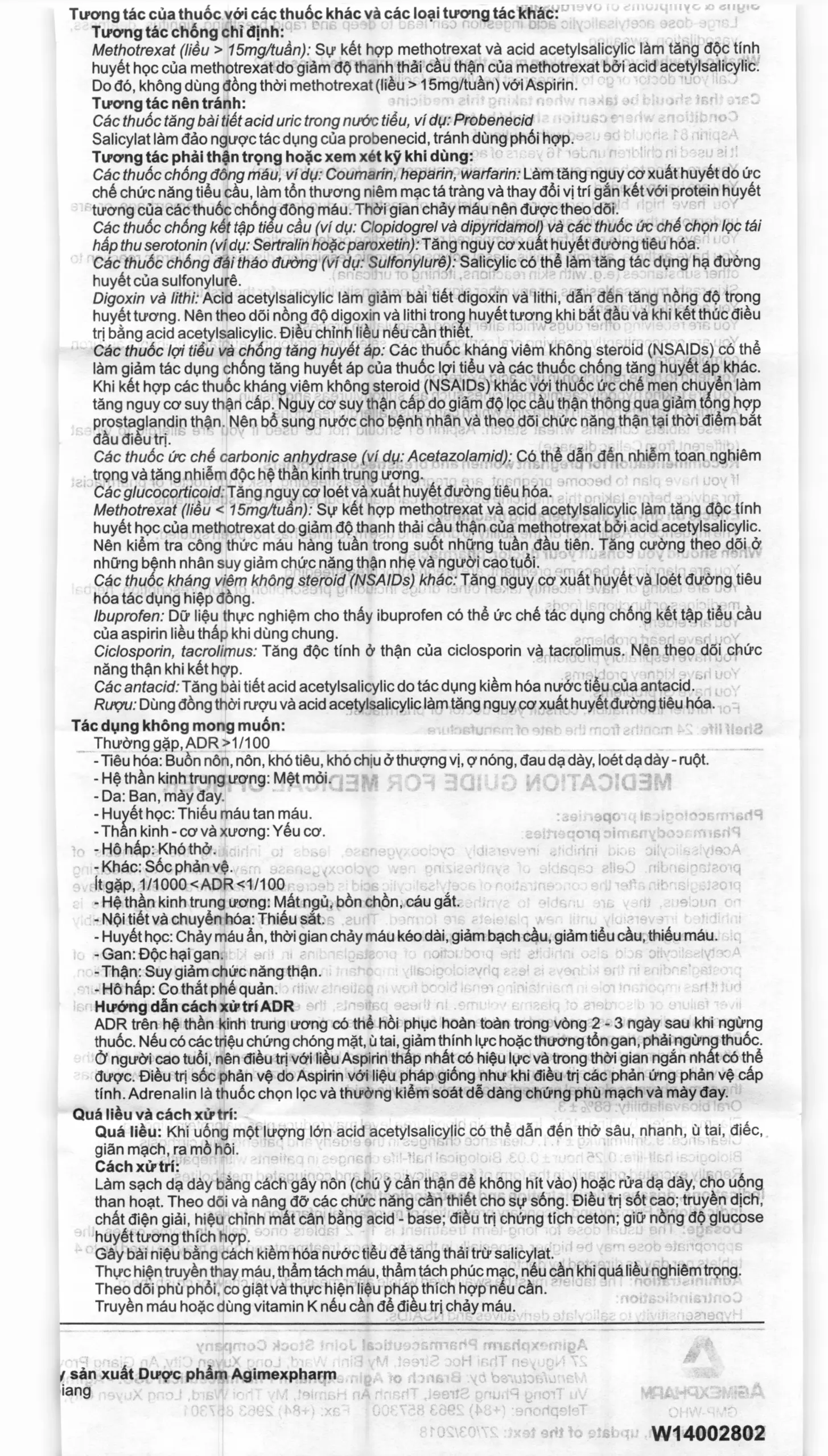 - Methotrexat (liều < 15mg/tuần): Sự kết hợp methotrexat và acid acetylsalicylic làm tăng độc tính huyết học của methotrexat do giảm độ thanh thải cầu thận của methotrexat bởi acid acetylsalicylic. Nên kiểm tra công thức máu hàng tuần trong suốt những tuần đầu tiên. Tăng cường theo dõi ở những bệnh nhân suy giảm chức năng thận nhẹ và người cao tuổi.