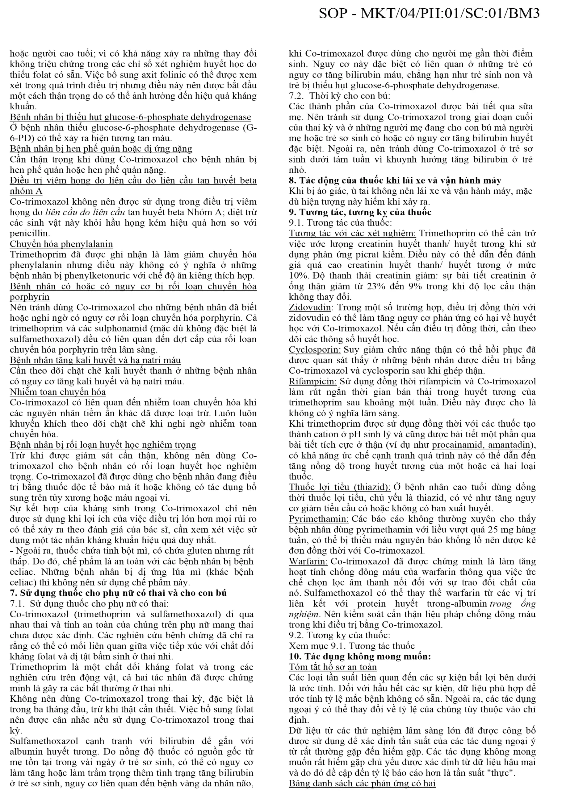 - Sulfamethoxazol cạnh tranh với bilirubin để gắn với albumin huyết tương. Do nồng độ thuốc có nguồn gốc từ mẹ tồn tại trong vài ngày ở trẻ sơ sinh, có thể có nguy cơ làm tăng hoặc làm trầm trọng thêm tình trạng tăng bilirubin ở trẻ sơ sinh, nguy cơ liên quan đến bệnh vàng da nhân não, khi Co-trimoxazol được dùng cho người mẹ gần thời điểm sinh. Nguy cơ này đặc biệt có liên quan ở những trẻ có nguy cơ tăng bilirubin máu, chẳng hạn như trẻ sinh non và trẻ bị thiếu hụt glucose-6-phosphate dehydrogenase.