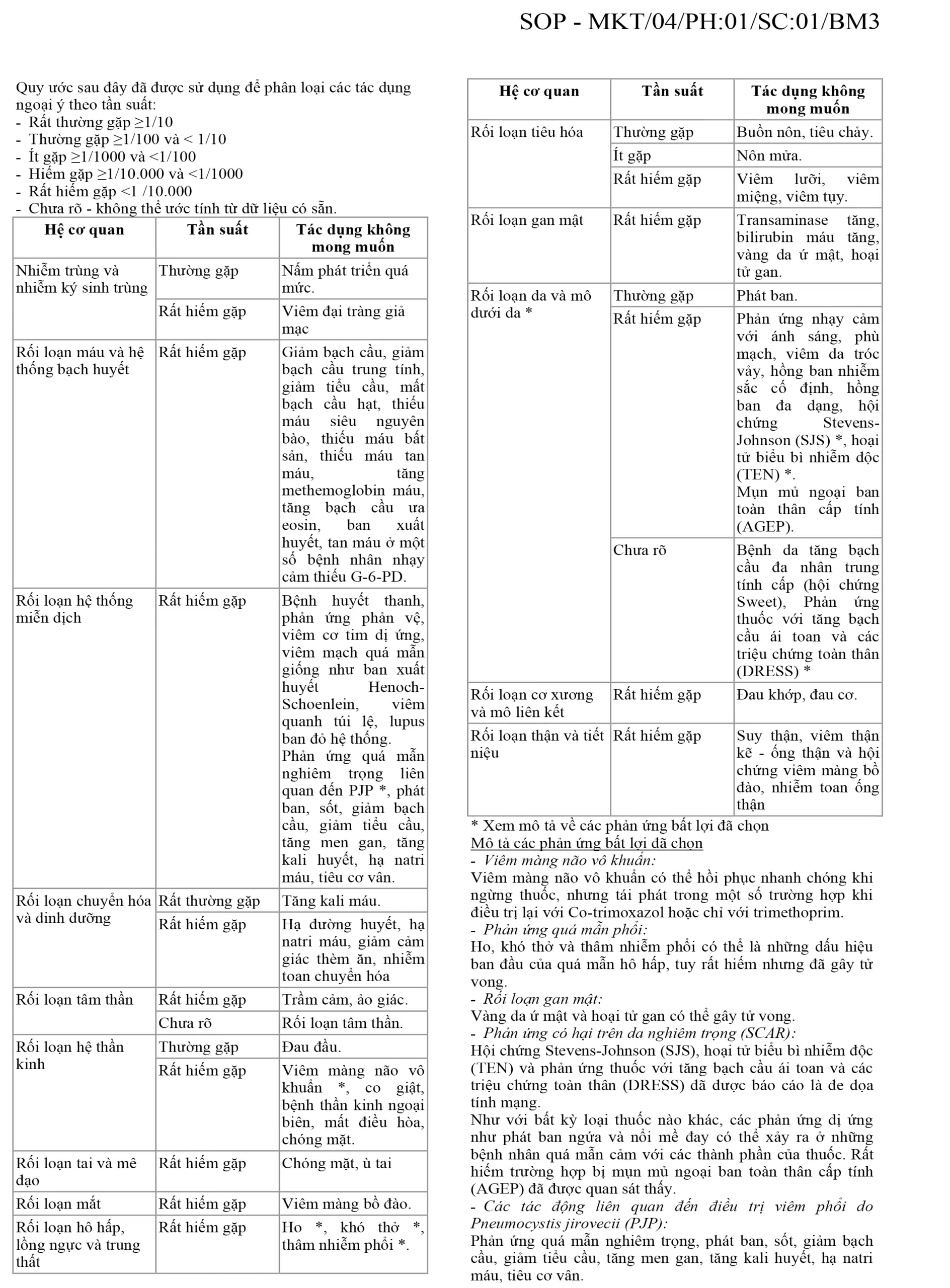 - Các phản ứng trên da đe dọa tính mạng như Hội chứng Stevens-Johnson (SJS), hoại tử biểu bì nhiễm độc (TEN), phản ứng thuốc với tăng bạch cầu ái toan và các triệu chứng toàn thân (DRESS) đã được báo cáo khi sử dụng Co-trimoxazol.