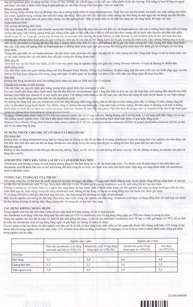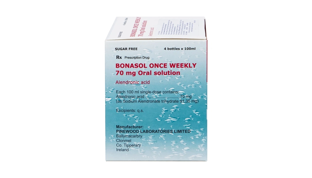 - Bonasol Once Weekly 70 mg Oral Solution phải được uống ít nhất 30 phút trước khi ăn, uống hoặc dùng thuốc lần đầu trong ngày và chỉ được uống cùng nước lọc. Các loại đồ uống khác (kể cả nước khoáng), thức ăn và một số thuốc có thể làm giảm sự hấp thu của alendronic acid.