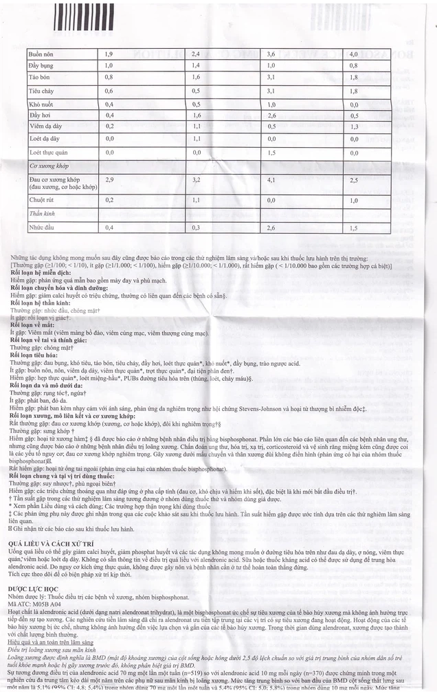 - Đau xương, khớp và/hoặc đau cơ đã được báo cáo ở những bệnh nhân sử dụng bisphosphonat. Theo báo cáo sau khi thuốc lưu hành, các triệu chứng này hiếm khi ở mức nghiêm trọng và/hoặc làm mất khả năng vận động. Thời gian bắt đầu xuất hiện triệu chứng này dao động từ một ngày tới vài tháng sau khi bắt đầu điều trị. Phần lớn bệnh nhân đã giảm triệu chứng sau khi ngừng thuốc. Một số bệnh nhân bị tái phát khi dùng lại với cùng thuốc đó hoặc với một bisphosphonat khác.