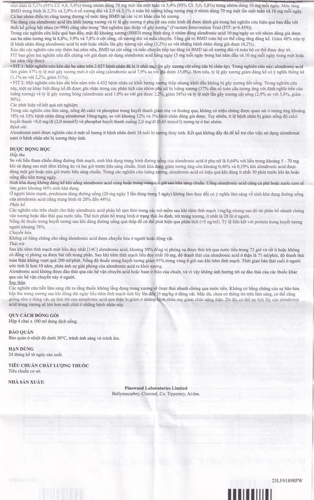 - Tác dụng của alendronic acid lên khối lượng xương và tỷ lệ gãy xương ở phụ nữ sau mãn kinh đã được đánh giá trong hai nghiên cứu hiệu quả ban đầu với thiết kế giống hệt nhau (n=994) cũng như trong “thử nghiệm can thiệp về gãy xương” (Fracture Intervention Trial (FIT: n=6.459)).