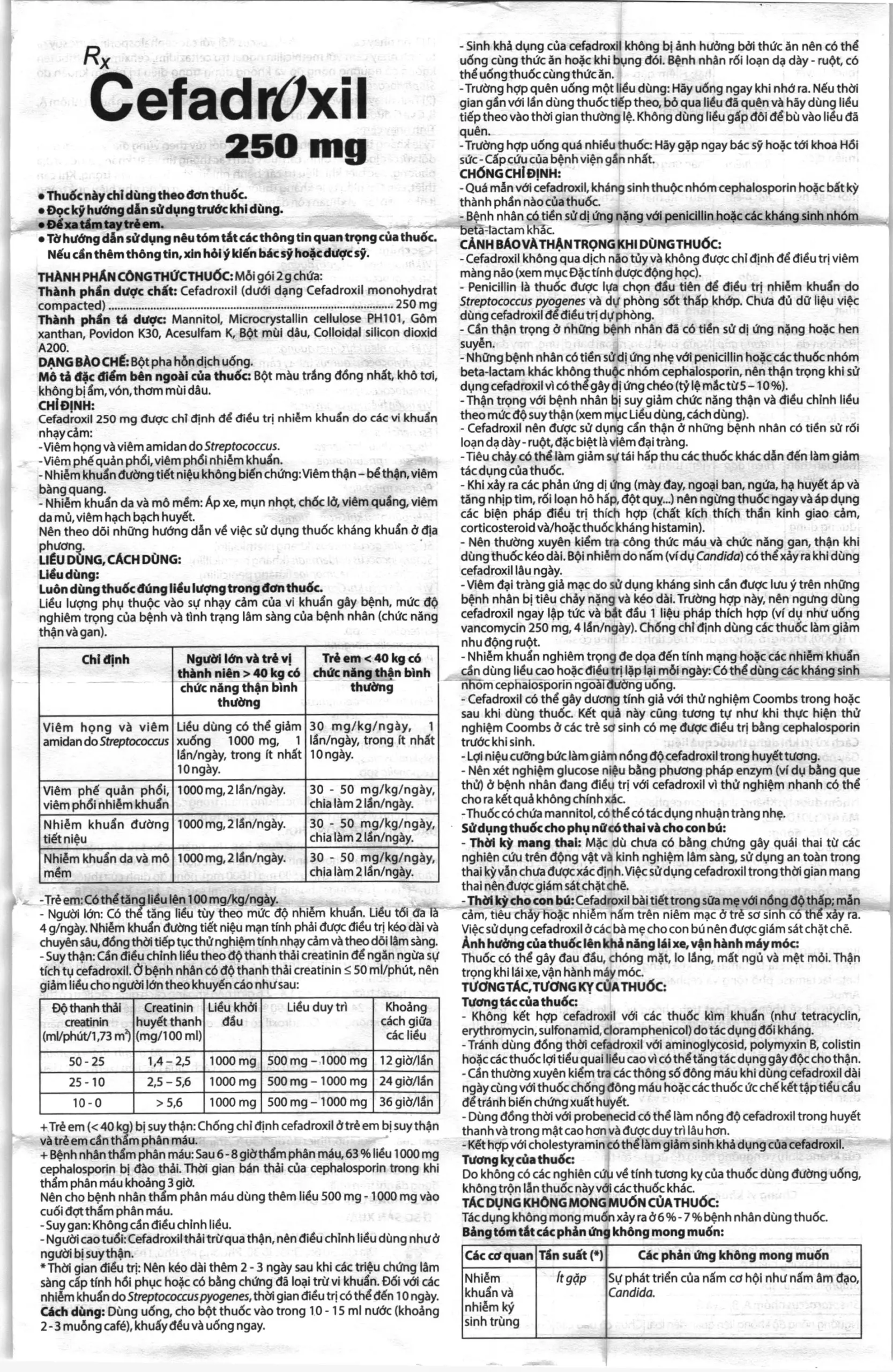 - Cần điều chỉnh liều theo độ thanh thải creatinin để ngăn ngừa sự tích tụ cefadroxil. Ở bệnh nhân có độ thanh thải creatinin < 50ml/phút, nên giảm liều cho người lớn theo khuyến cáo như sau: