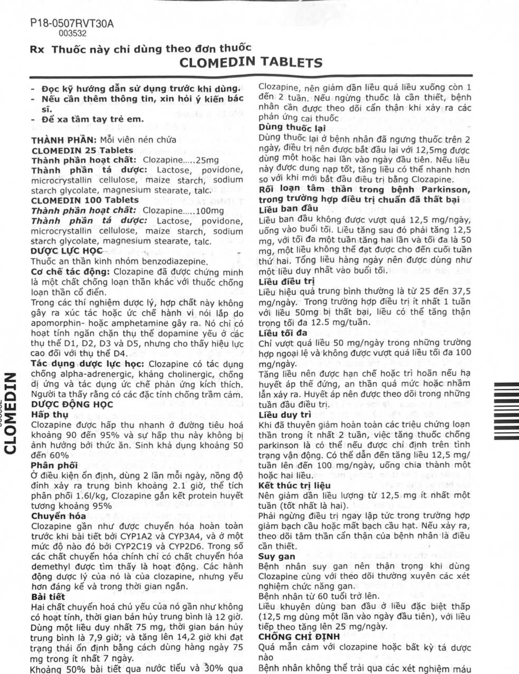 - Quá mẫn cảm với clozapine hoặc bất kỳ tá dược nào của thuốc Clomedin Tablets.