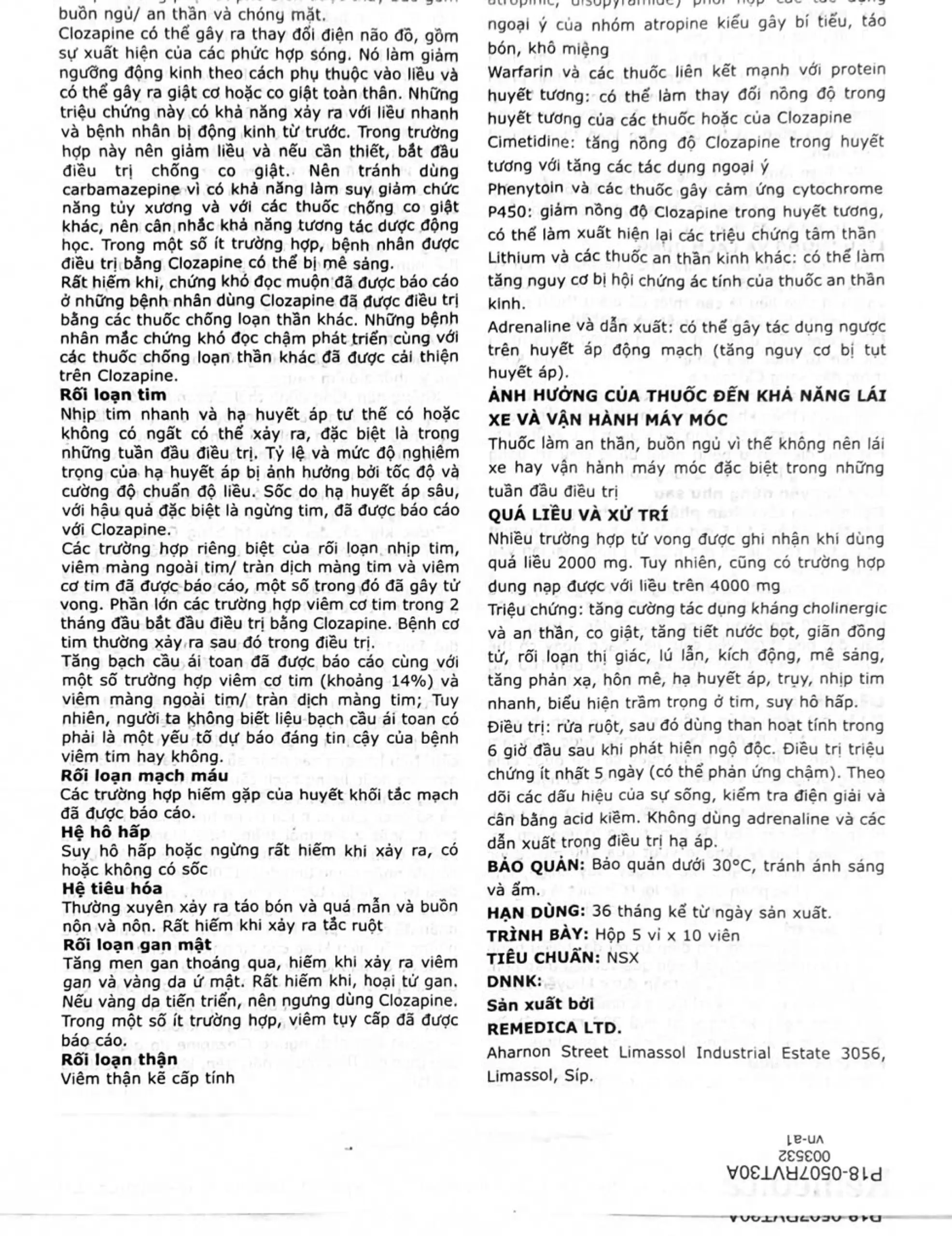 - Các trường hợp riêng biệt của rối loạn nhịp tim, viêm màng ngoài tim/ tràn dịch màng tim và viêm cơ tim đã được báo cáo, một số trong đó đã gây tử vong. Phần lớn các trường hợp viêm cơ tim trong 2 tháng đầu bắt đầu điều trị bằng Clozapine. Bệnh cơ tim thường xảy ra sau đó trong điều trị.