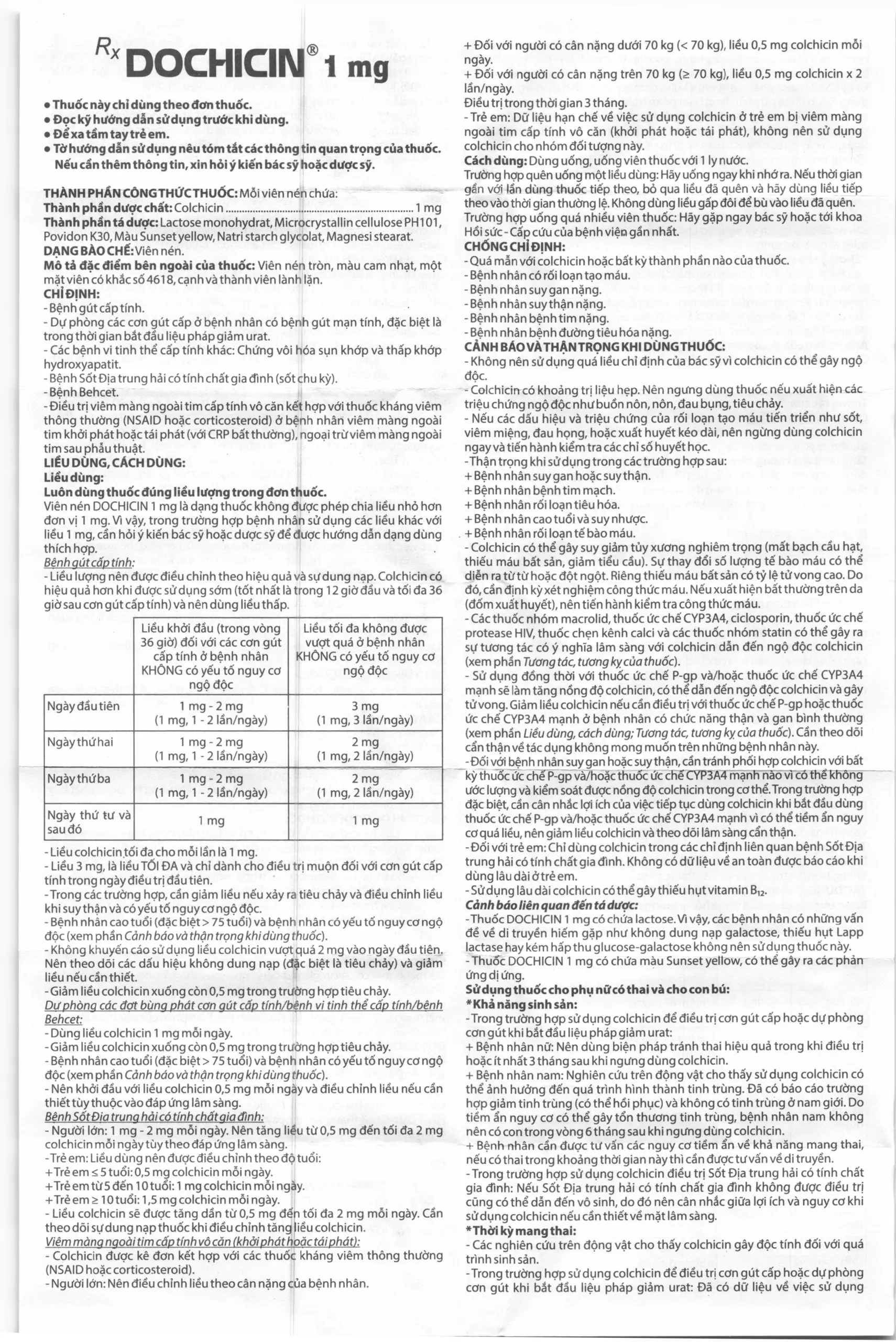 - Viên nén DOCHICIN 1mg là dạng thuốc không được phép chia liều nhỏ hơn đơn vị 1mg. Vì vậy, trong trường hợp bệnh nhân sử dụng các liều khác với liều 1mg, cần hỏi ý kiến bác sỹ hoặc dược sỹ để được hướng dẫn dạng dùng thích hợp.