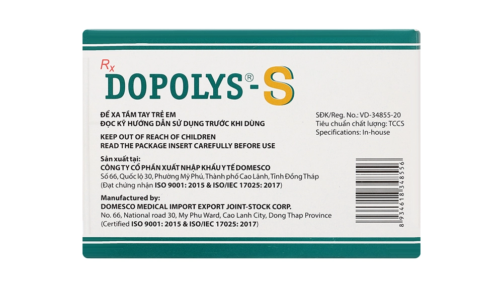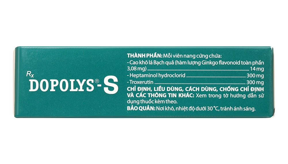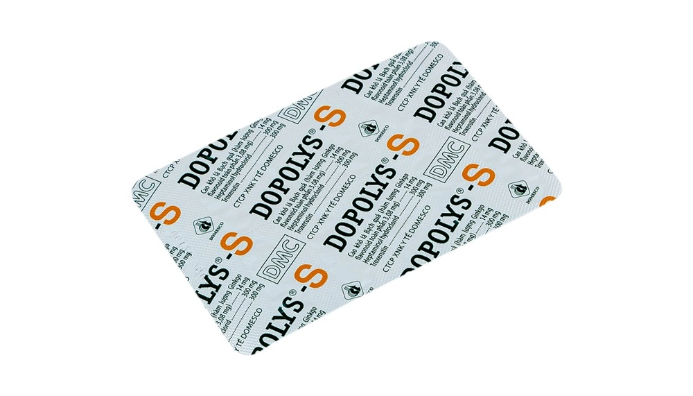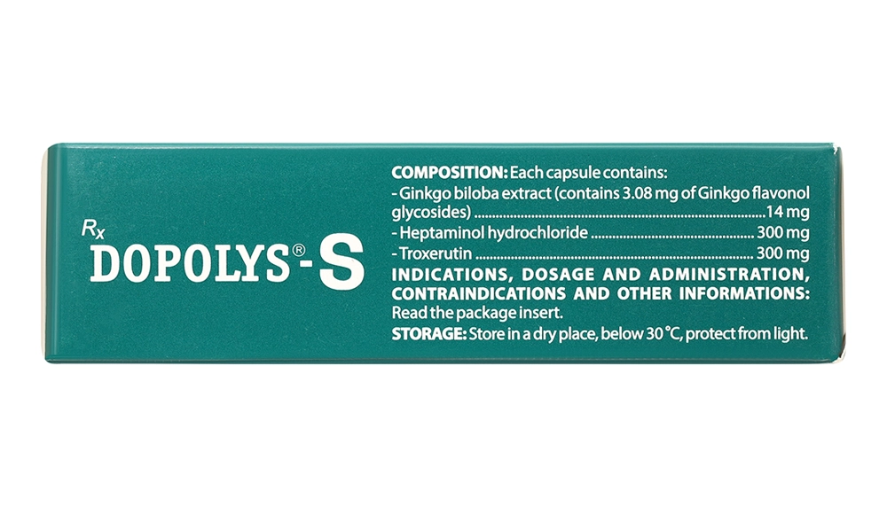 - DOPOLYS- S có tác dụng trợ tĩnh mạch và bảo vệ mạch máu, làm tăng trương lực tĩnh mạch, sức bền mao mạch và giảm tính thấm của mạch máu. Những tác dụng này kết hợp với tính ức chế tại chỗ đối với vài chất trung gian gây đau (histamin, bradykinin, serotonin), enzym thủy phân trong lysosome, gốc tự do gây viêm và thoái hóa sợi collagen. DOPOLYS – S giúp cho máu tĩnh mạch dễ trở về tim phải do trong công thức có heptaminol hydroclorid.