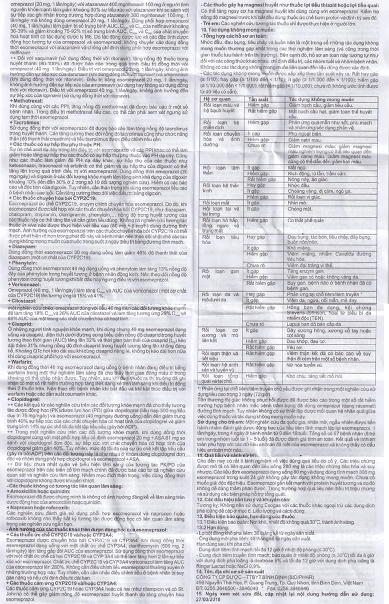 - Hạ magnesi huyết: Đã có các báo cáo về hạ magnesi huyết nghiêm trọng ở những bệnh nhân được điều trị bằng các thuốc ức chế bơm proton (PPI) như esomeprazol trong ít nhất ba tháng và trong hầu hết các trường hợp sử dụng PPI trong một năm. Các biểu hiện nghiêm trọng của hạ magnesi huyết như mệt mỏi, co cứng, mê sảng, co giật, choáng váng và loạn nhịp thất có thể xảy ra, nhưng có thể khởi phát âm thầm và không được lưu tâm. Ở hầu hết các bệnh nhân bị ảnh hưởng, tình trạng giảm magnesi huyết được cải thiện sau khi sử dụng liệu pháp thay thế magnesi và ngừng sử dụng PPI. Đối với bệnh nhân dự kiến sẽ được điều trị kéo dài với PPI hoặc bệnh nhân dùng PPT cùng với digoxin hoặc các thuốc khác có thể hạ magnesi huyết (như các thuốc lợi tiểu), các chuyên gia y tế nên cân nhắc đo nồng độ magnesi trước khi bắt đầu điều trị với PPI và định kỳ trong quá trình điều trị.