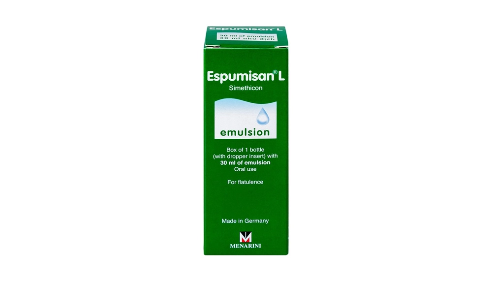 - Espumisan L có chứa hoạt chất simethicon, là một polydimethylsiloxane hoạt động theo cơ chế bề mặt và ổn định. Nó làm giảm sức căng bề mặt của bọt khí bao bọc quanh thức ăn và trong màng nhày của đường tiêu hoá, do đó, phá vỡ bọt khí. Hơi giải phóng ra có thể được hấp thụ bởi thành ruột và thải trừ qua nhu động.