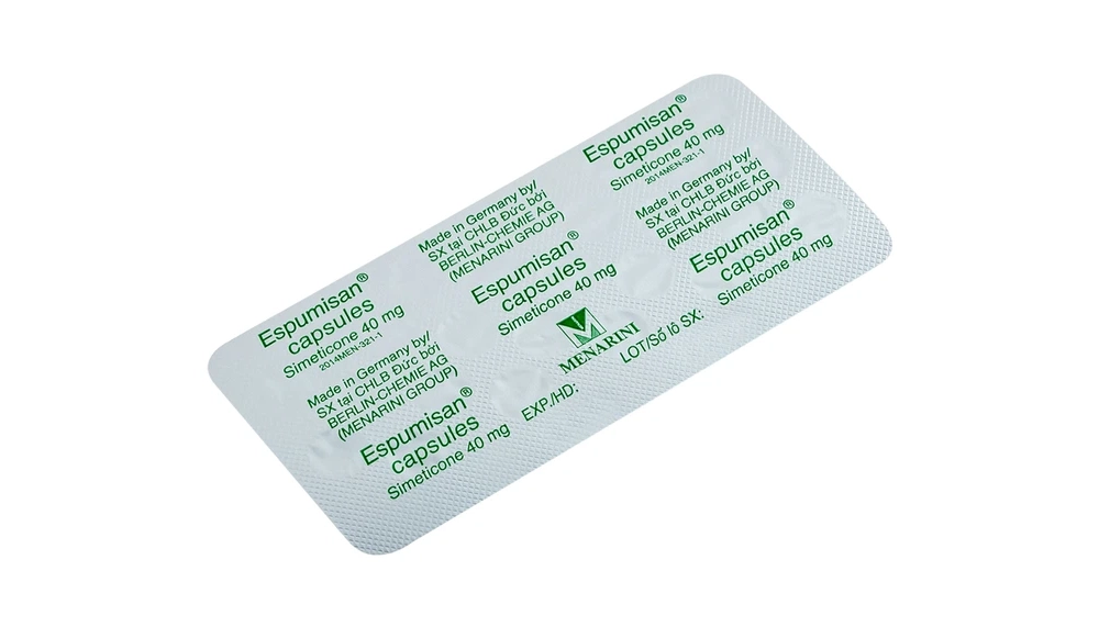 - Espumisan 40mg điều trị các triệu chứng liên quan đến sự tích tụ khí trong đường tiêu hoá như: đầy hơi, chướng bụng.