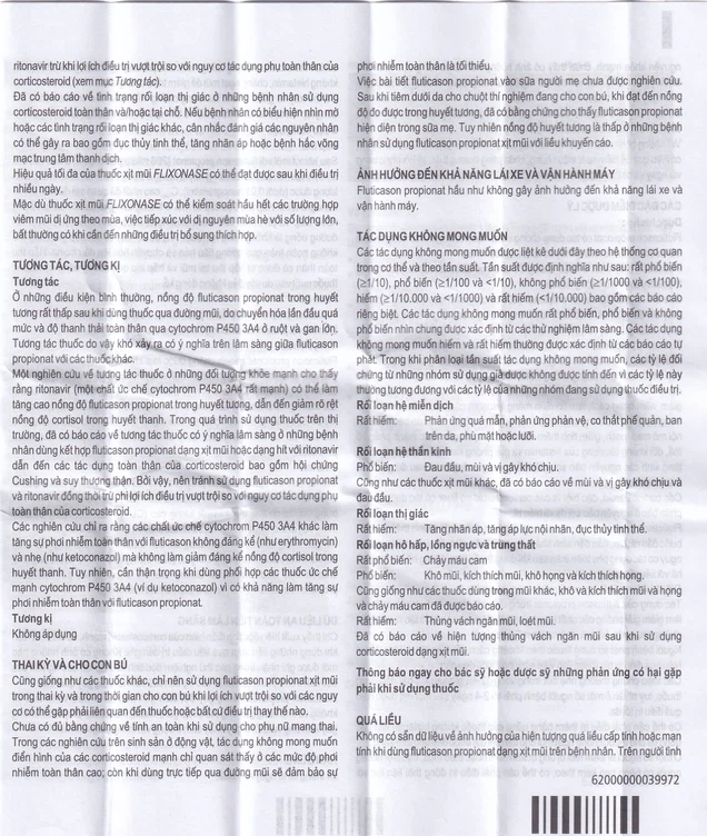 - Trong quá trình sử dụng thuốc trên thị trường, đã có báo cáo về tương tác thuốc có ý nghĩa lâm sàng ở những bệnh nhân dùng fluticasone propionate và ritonavir dẫn đến tác dụng toàn thân của corticosteroid bao gồm hội chứng Cushing và suy thượng thận. Do đó nên tránh dùng đồng thời fluticasone propionate và ritonavir trừ khi lợi ích điều trị vượt trội so với nguy cơ tác dụng phụ toàn thân của corticosteroid (xem mục Tương tác).