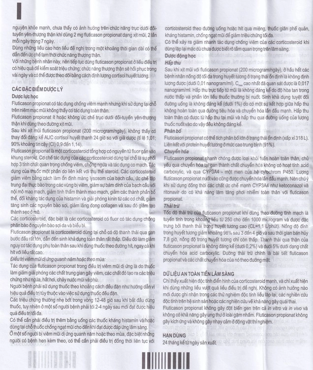 - Fluticason propionat có hoạt tính chống viêm mạnh nhưng khi sử dụng tại chỗ trên niêm mạc mũi thì không quan sát thấy tác dụng toàn thân.