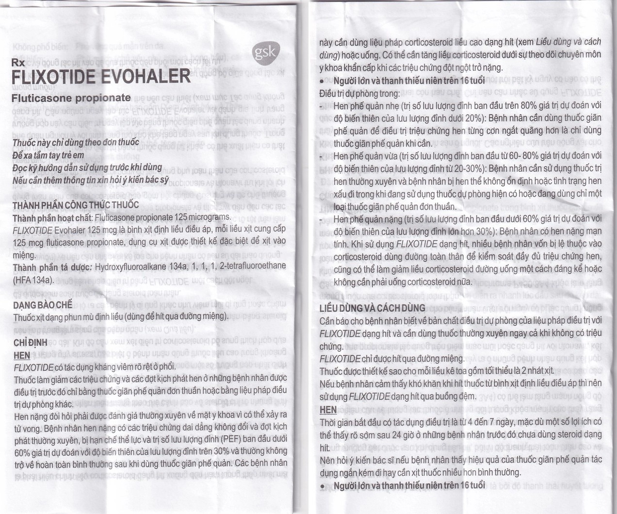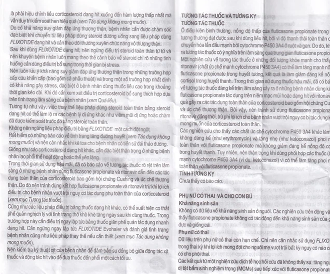 - Cũng như các liệu pháp điều trị bằng thuốc dạng hít khác, có thể xuất hiện co thắt phế quản nghịch lý với tình trạng thở khò khè tăng ngay sau khi dùng thuốc. Trong trường hợp này cần điều trị ngay lập tức bằng thuốc giãn phế quản tác dụng nhanh dạng hít. Cần ngừng ngay lập tức Flixotide Evohaler và đánh giá tình trạng bệnh nhân cũng như liệu pháp thay thế nếu cần thiết (xem mục Tác dụng không mong muốn)