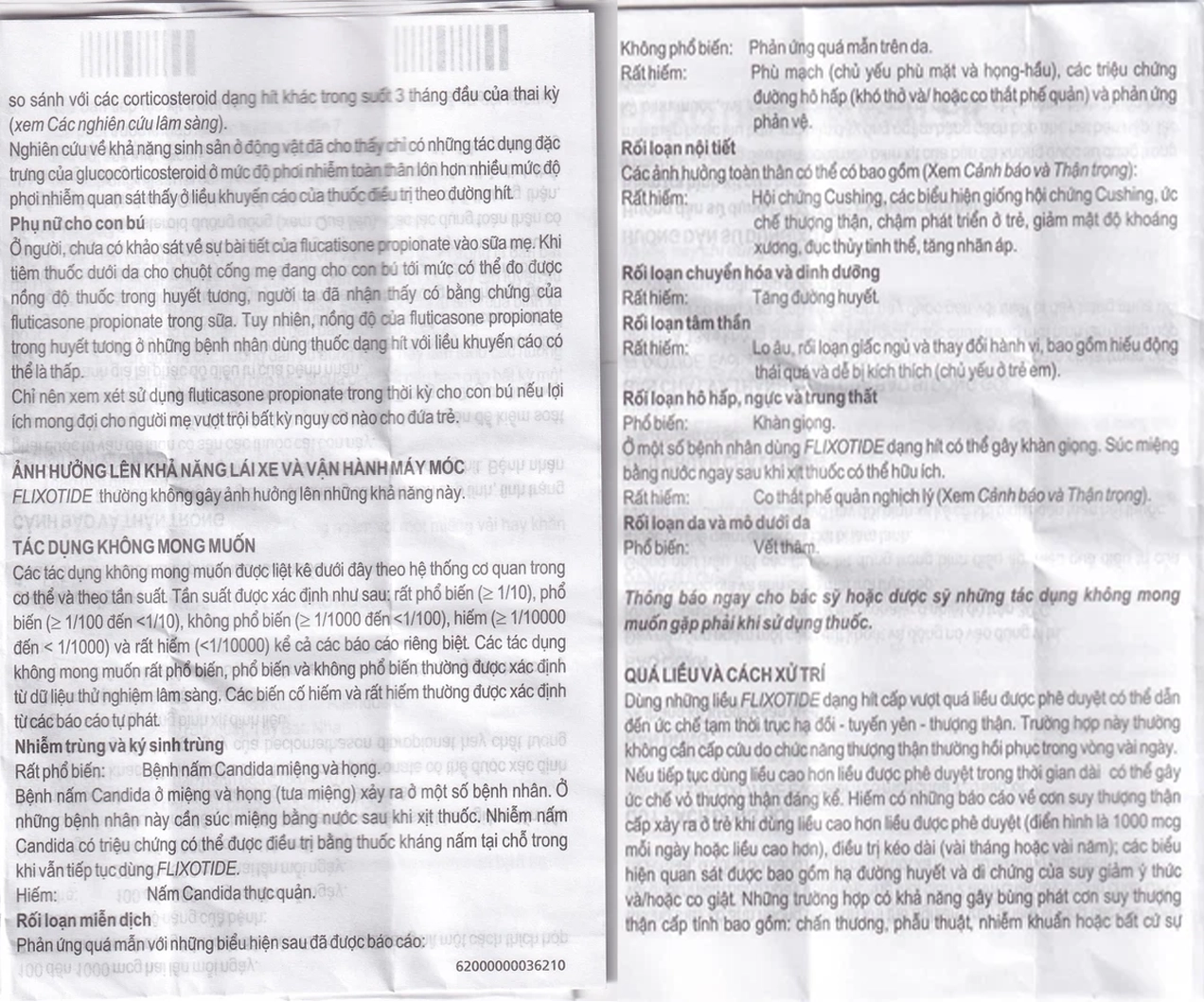 - Ở một số bệnh nhân dùng Flixotide 125mcg dạng hít có thể gây khản giọng. Súc miệng bằng nước ngay sau khi xịt thuốc có thể hữu ích.