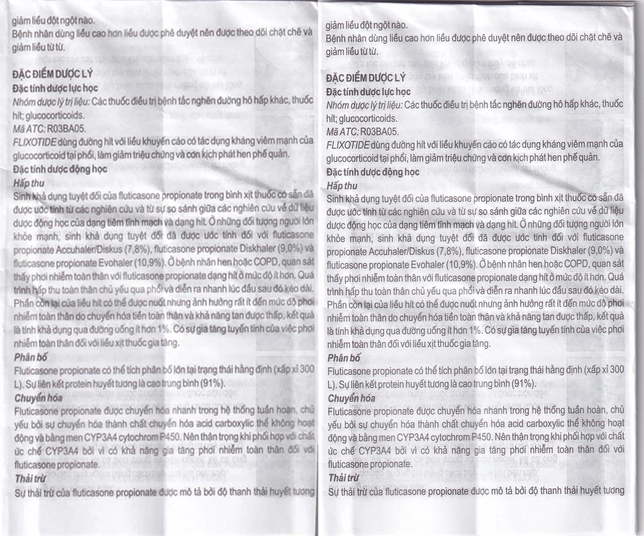 - Ở điều kiện bình thường, nồng độ thấp của fluticasone propionate trong huyết tương thường đạt được sau khi dùng liều hít, bởi vì độ thanh thải toàn thân cao và chuyển hóa lần đầu mạnh bởi cytochrome P450 3A4 ở ruột và gan. Do đó, khó xảy ra tương tác thuốc ý nghĩa trên lâm sàng qua trung gian fluticasone propionate.