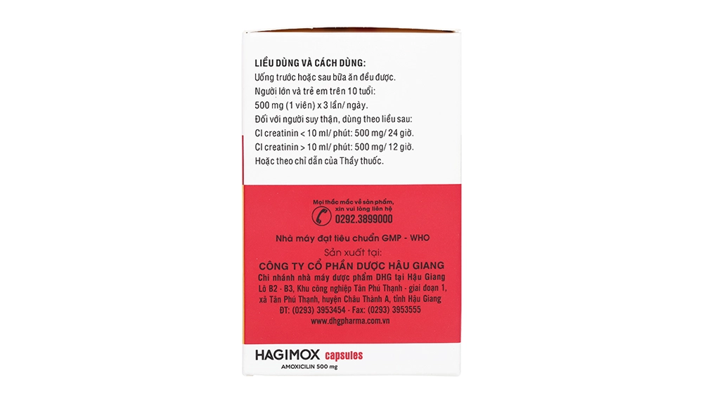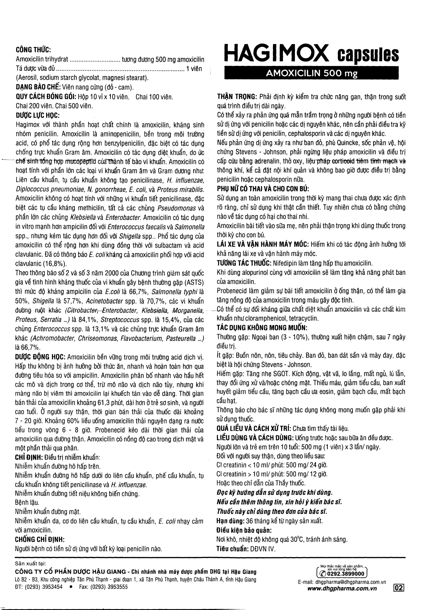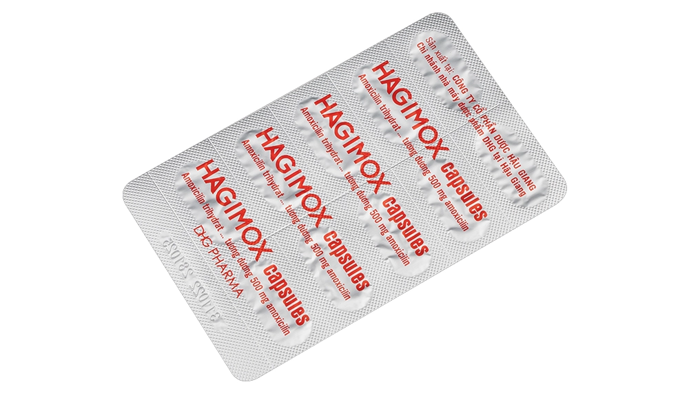 - Hagimox Capsules 500mg với thành phần hoạt chất chính là amoxicilin, kháng sinh nhóm penicilin.