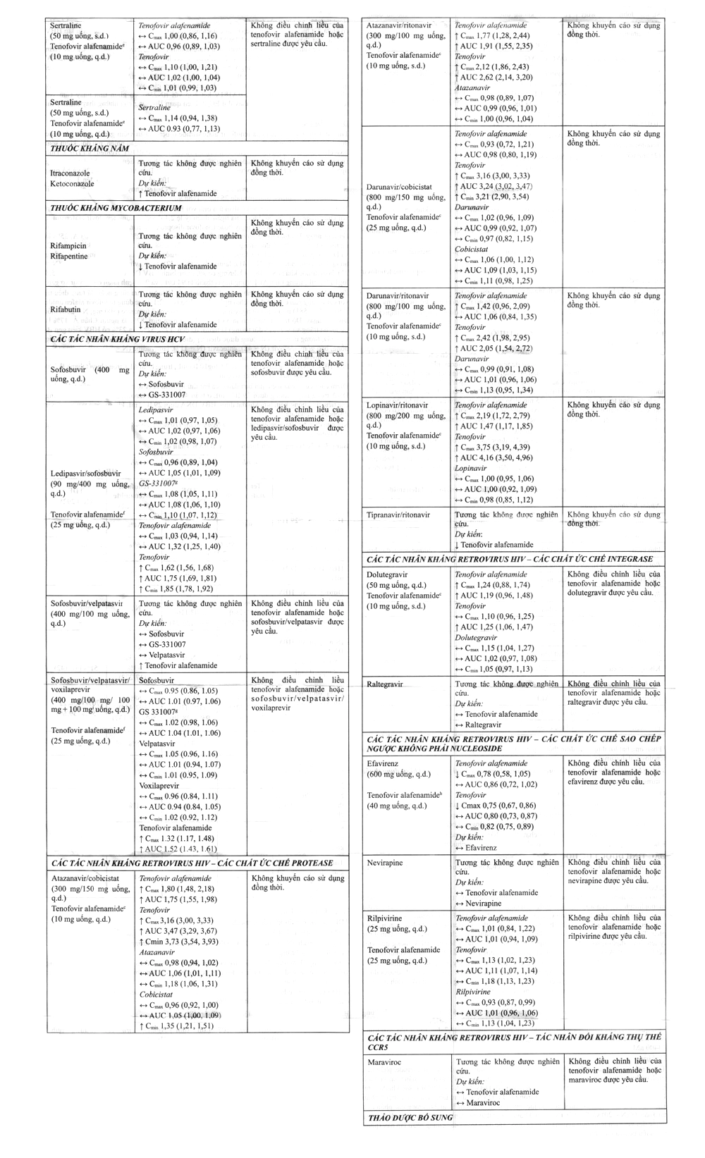- Thuốc chống động kinh (carbamazepine, oxcarbazepine, phenobarbital, phenytoin), thuốc kháng lao (rifabutin, rifampin), St. John’s Wort làm giảm nồng độ Tenofovir Alafenamide trong máu. Nên tăng liều Tenofovir Alafenamide thành 2 viên 25 mg/ngày khi phối hợp với carbamazepine. Các phối hợp còn lại không được khuyến cáo.