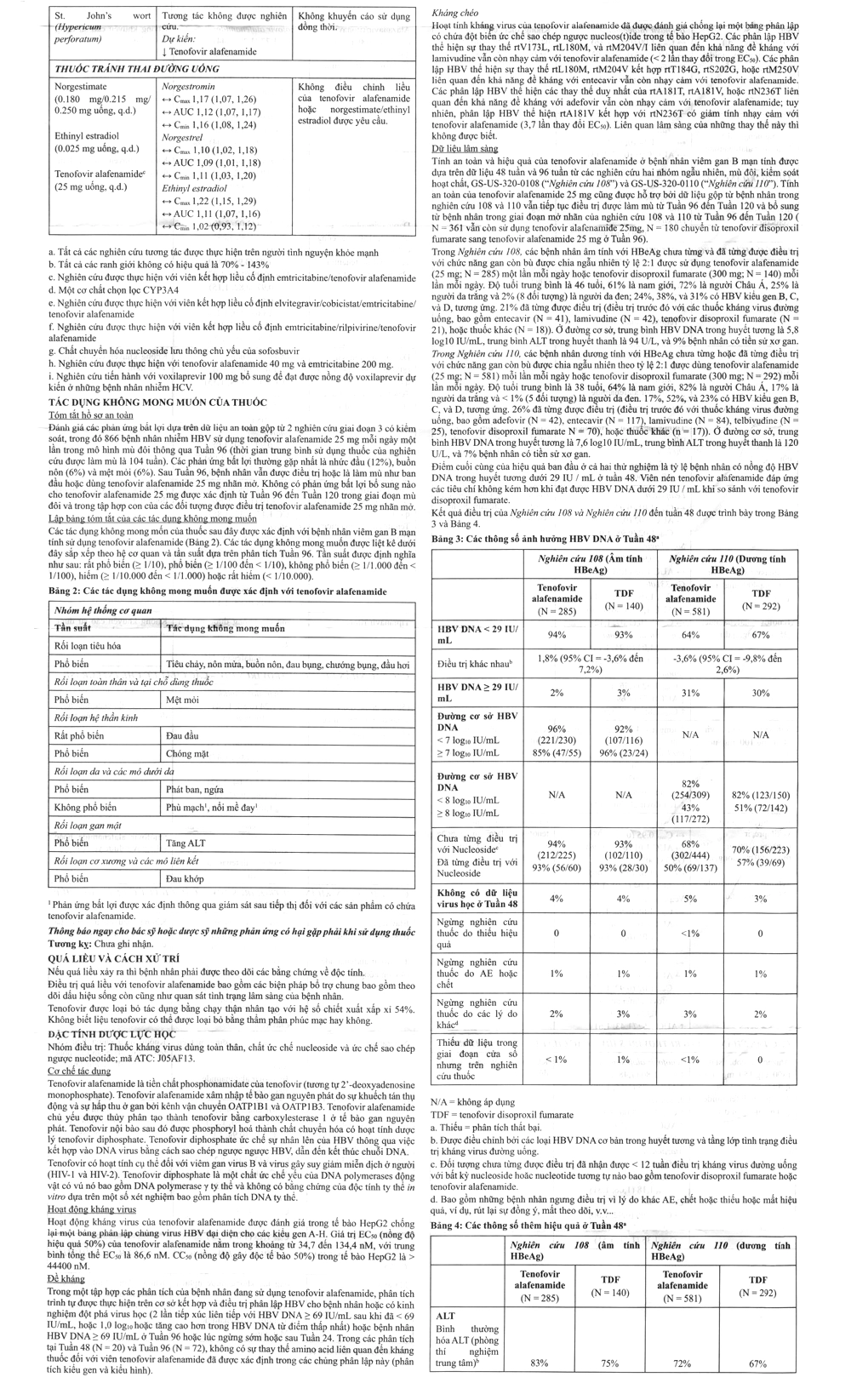 - Do nguy cơ phát triển đề kháng HIV – 1, không khuyến cáo dùng Tenofovir Alafenamide đơn trị ở bệnh nhân nhiễm HIV – 1. Tính an toàn và hiệu quả của thuốc chưa được thiết lập ở bệnh nhân đồng nhiễm HBV và HIV – 1. Nên xét nghiệm kháng thể kháng HIV trước khi sử dụng thuốc này cho bệnh nhân nhiễm HBV, nếu dương tính với HIV, khuyến cáo dùng phác đồ kết hợp thuốc kháng retrovirus.