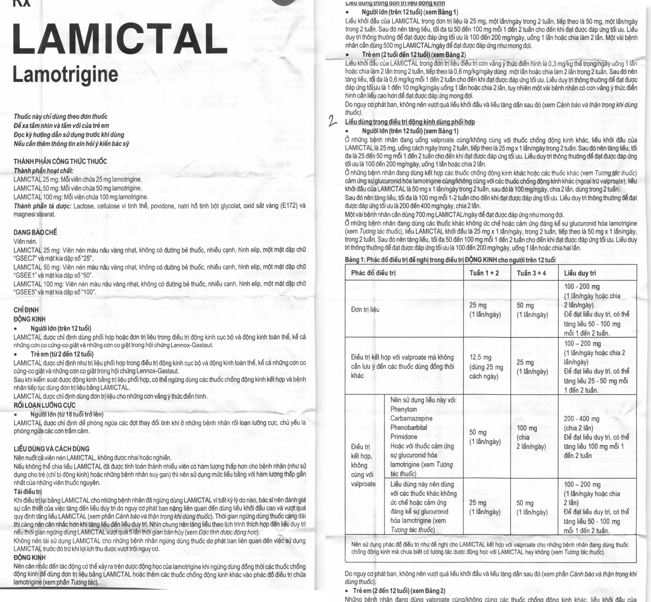 - Ở những bệnh nhân đang dùng kết hợp các thuốc chống động kinh khác hoặc các thuốc khác (xem Tương tác thuốc) cảm ứng sự glucuronid hóa lamotrigine cùng/không cùng với các thuốc chống động kinh khác (ngoại trừ valproate), liều khởi đầu của LAMICTAL là 50 mg x 1 lần/ngày trong 2 tuần, sau đó là 100 mg/ngày, chia 2 lần, dùng trong 2 tuần.