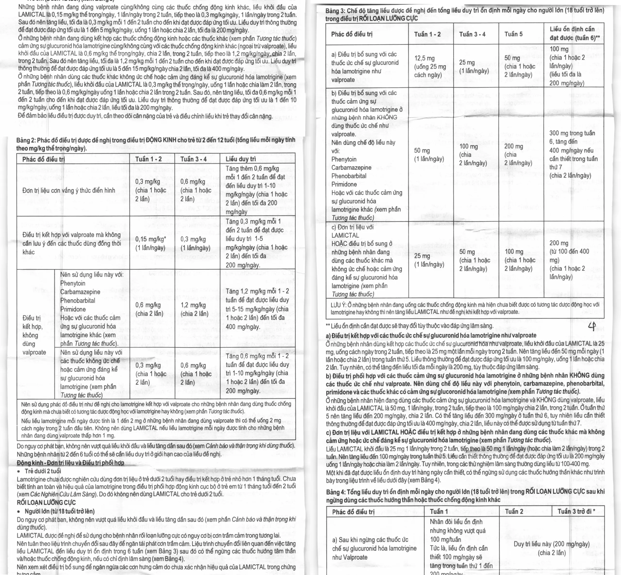 - Những bệnh nhân đang dùng valproate cùng/không cùng các thuốc chống động kinh khác, liều khởi đầu của LAMICTAL là 0,15 mg/kg thể trọng/ngày, 1 lần/ngày trong 2 tuần, tiếp theo là 0,3 mg/kg/ngày, 1 lần/ngày trong 2 tuần. Sau đó nên tăng liều, tối đa là 0,3 mg/kg mỗi 1 đến 2 tuần cho đến khi đạt được đáp ứng tối ưu. Liều duy trì thông thường để đạt được đáp ứng tối ưu là 1 đến 5 mg/kg/ngày, uống 1 lần hoặc chia 2 lần, tối đa là 200 mg/ngày.