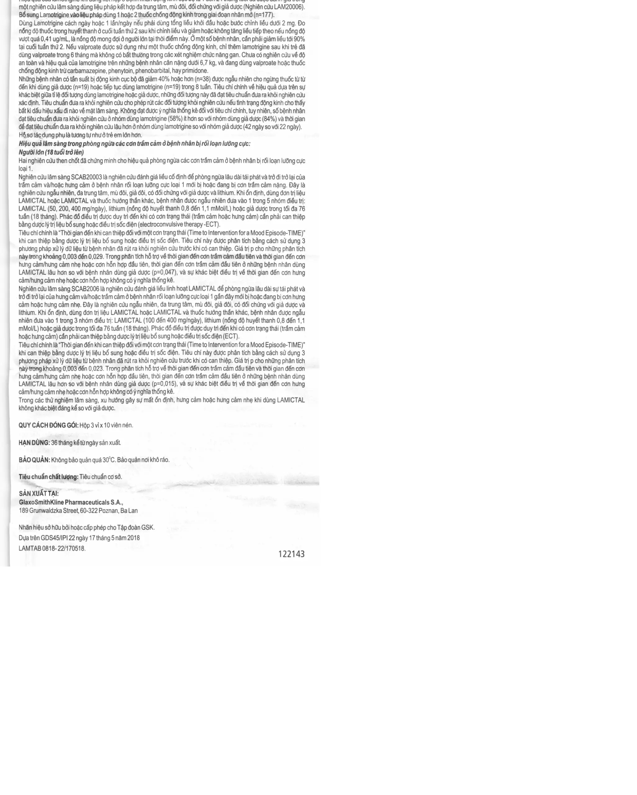 - Nghiên cứu lâm sàng SCAB20003 là nghiên cứu đánh giá liều cố định để phòng ngừa lâu dài tái phát và trở đi trở lại của trầm cảm và/hoặc hưng cảm ở bệnh nhân rối loạn lưỡng cực loại 1 mới bị hoặc đang bị cơn trầm cảm nặng. Đây là nghiên cứu ngẫu nhiên, đa trung tâm, mù đôi, giả đôi, có đối chứng với giả dược và lithium. Khi ổn định, dùng đơn trị liệu LAMICTAL hoặc LAMICTAL và thuốc hướng thần khác, bệnh nhân được ngẫu nhiên đưa vào 1 trong 5 nhóm điều trị: LAMICTAL (50, 200, 400 mg/ngày), lithium (nồng độ huyết thanh 0,8 đến 1,1 mMol/L) hoặc giả dược trong tối đa 76 tuần (18 tháng). Phác đồ điều trị được duy trì đến khi có cơn trạng thái (trầm cảm hoặc hưng cảm) cần phải can thiệp bằng dược lý trị liệu bổ sung hoặc điều trị sốc điện (electroconvulsive therapy -ECT).