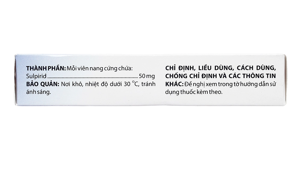 - Hấp thu: Sulpirid được hấp thu chậm từ đường tiêu hóa. Sau khi uống 1 viên nang 50mg, nồng độ đỉnh của Sulpirid trong huyết tương đạt được theo thứ tự 0,73 mg/lít và 0,25 mg/lít trong vòng từ 3 – 6 giờ. Sinh khả dụng dạng uống từ 25% đến 35%, thay đổi nhiều giữa các người bệnh.