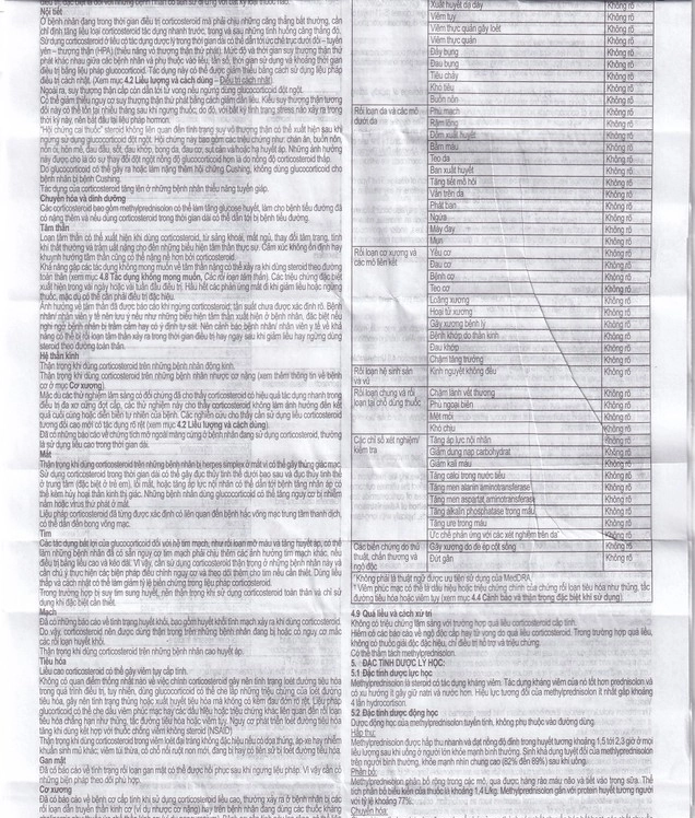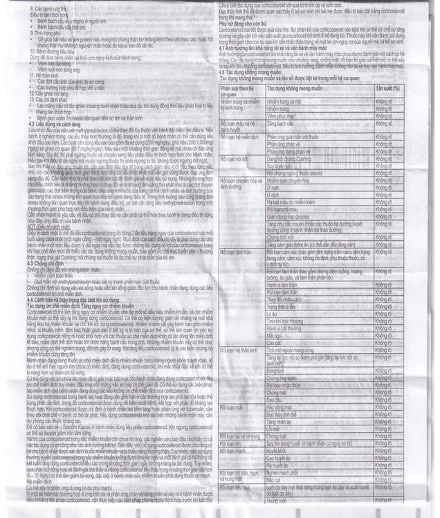 - Đã có báo cáo về bệnh cơ cấp tính khi sử dụng corticosteroid liều cao, thường xảy ra ở bệnh nhân bị các rối loạn dẫn truyền thần kinh cơ (ví dụ nhược cơ nặng) hay trên bệnh nhân đang dùng các thuốc kháng cholinergic như thuốc ức chế thần kinh cơ (ví dụ pancuronium). Bệnh cơ cấp tính này lan rộng, có thể liên quan đến các cơ mắt, cơ hô hấp và có thể dẫn tới liệt chi. Tình trạng tăng creatinin kinase có thể xảy ra. Để có tiến triển về mặt lâm sàng hay hồi phục, cần ngừng thuốc trong vòng vài tuần đến vài năm. Loãng xương là tác dụng có hại chung, nhưng ít được nhận thấy xảy ra khi dùng glucocorticoid liều cao và kéo dài.