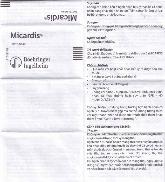 - Telmisartan được thải trừ chủ yếu qua mật. Sự thanh thải bị suy giảm ở những bệnh nhân bị bệnh lý tắc mật hay suy gan. Cần sử dụng MICARDIS thận trọng ở những bệnh nhân này.