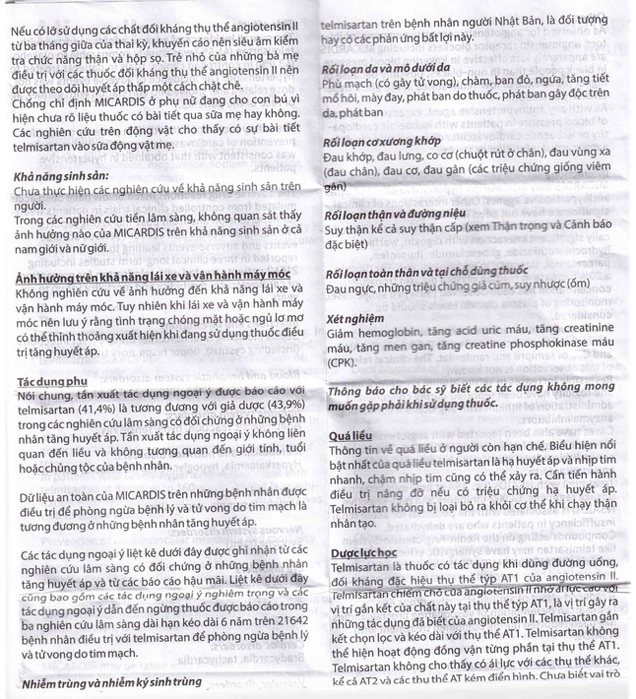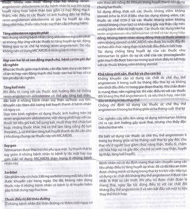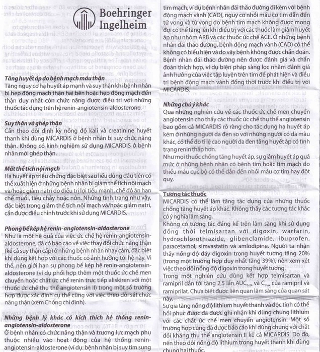 - Nói chung những bệnh nhân tăng aldosteron nguyên phát sẽ không đáp ứng với các thuốc trị tăng huyết áp tác động thông qua sự ức chế hệ thống renin-angiotensin. Do vậy không nên sử dụng MICARDIS ở những bệnh nhân này.
