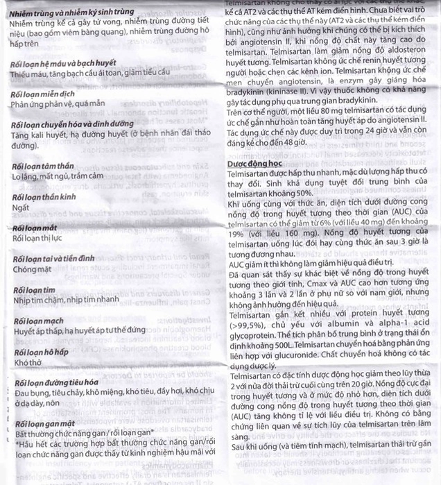 - Khi bắt đầu điều trị bằng telmisartan để giảm tỷ lệ mắc bệnh tim mạch, nên theo dõi chặt chẽ huyết áp và nếu có thể cần điều chỉnh thích hợp các loại thuốc làm giảm huyết áp.
