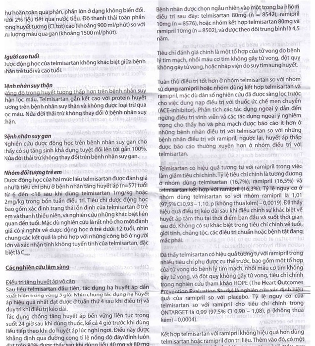 - Dược động học của telmisartan không khác biệt giữa bệnh nhân trẻ tuổi và cao tuổi.