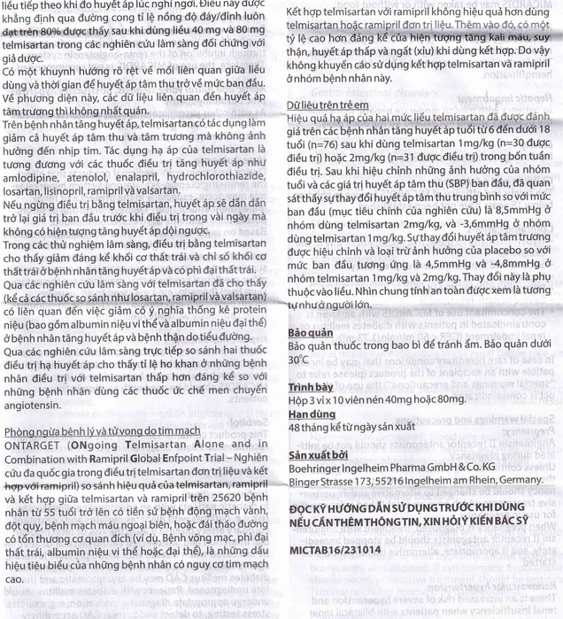 - Liều khuyến cáo là 80 mg x 1 lần/ngày. Người ta không biết liệu liều thấp hơn 80 mg telmisartan có hiệu quả trong việc giảm tỷ lệ mắc bệnh tim mạch hay không.