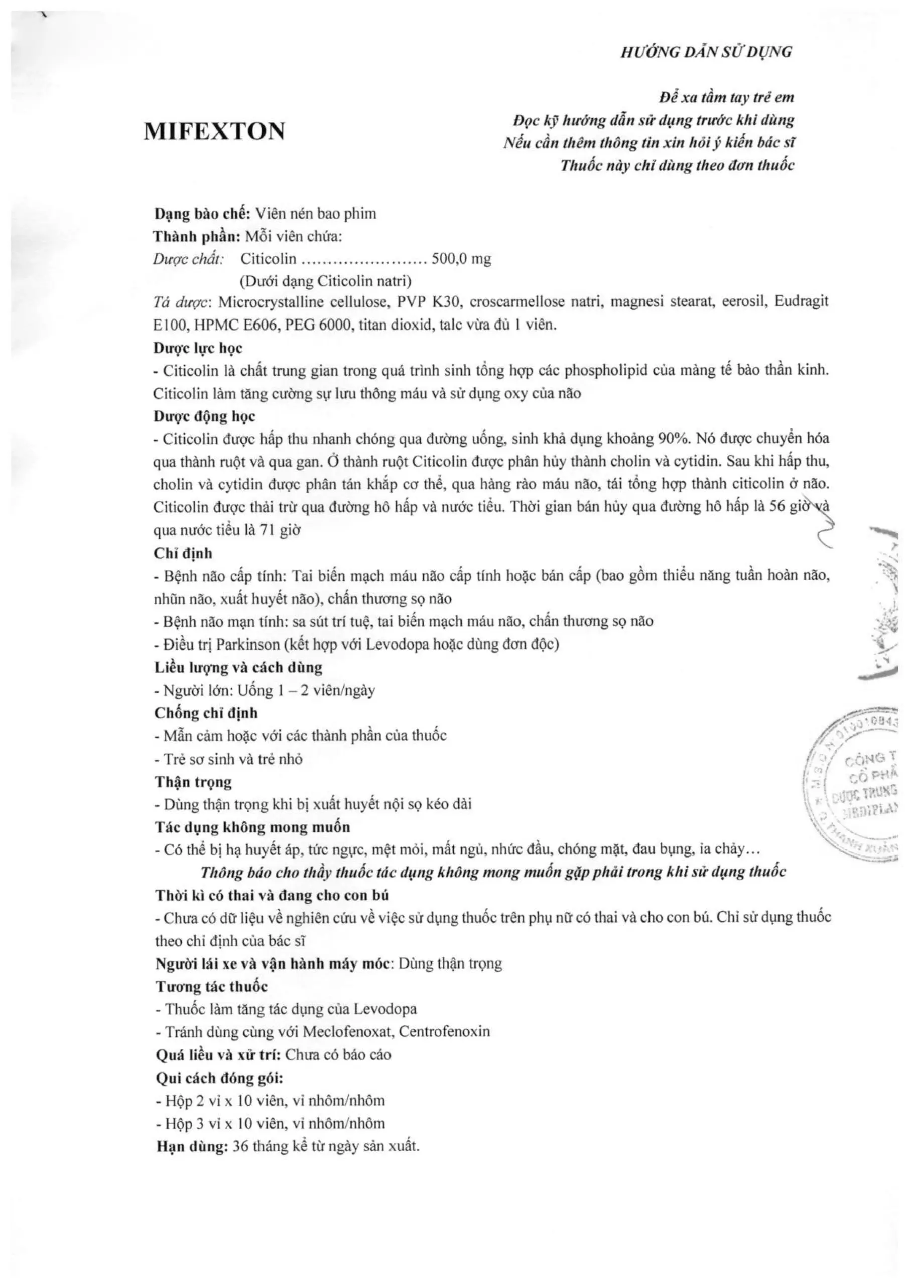 - Citicolin được thải trừ qua đường hô hấp và nước tiểu. Thời gian bán hủy qua đường hô hấp là 56 giờ và qua nước tiểu là 71 giờ.
