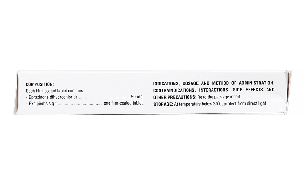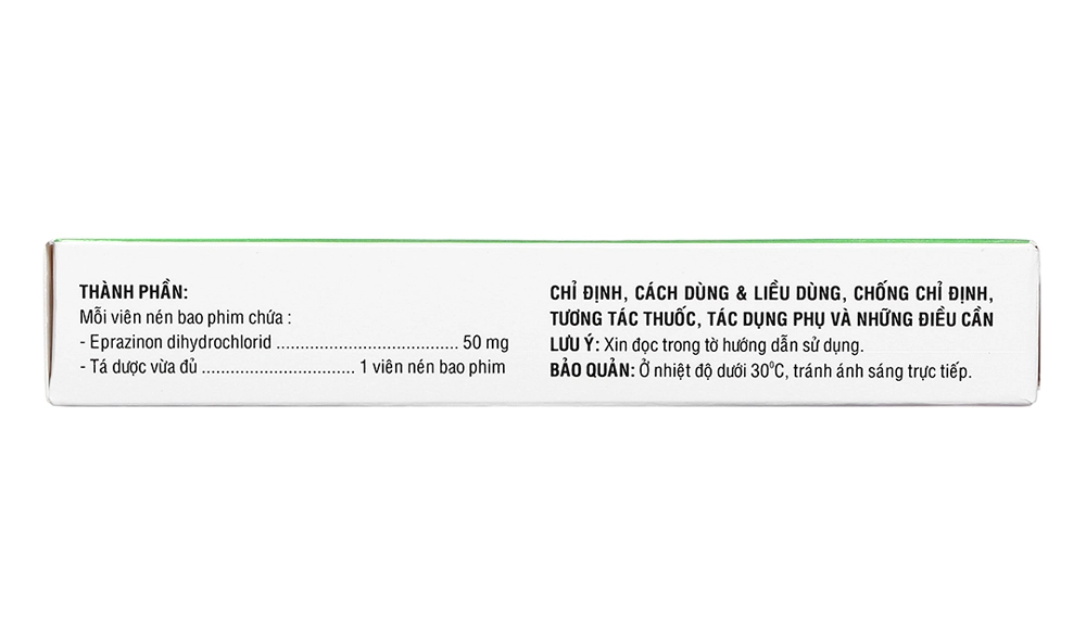 - Ở người bình thường, hàm lượng eprazinon cao nhất trong huyết tương đạt được sau 1 giờ. Thuốc được chuyển hóa chủ yếu qua gan. Thời gian bán thải khoảng 6 giờ.