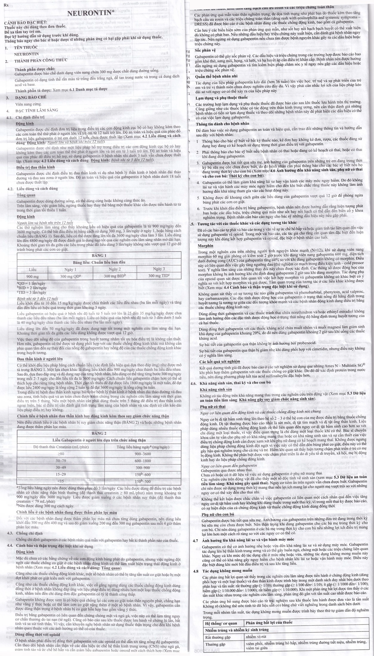 - Phát ban do thuốc cùng tăng bạch cầu ưa eosin và triệu chứng toàn thân (DRESS). Các phản ứng quá mẫn toàn thân, nghiêm trọng, đe dọa tính mạng như phát ban do thuốc cùng tăng bạch cầu ưa eosin và triệu chứng toàn thần (DRESS) đã được báo cáo ở những bệnh nhân dùng các thuốc chống đông kinh bao gồm cả Gabapentin.