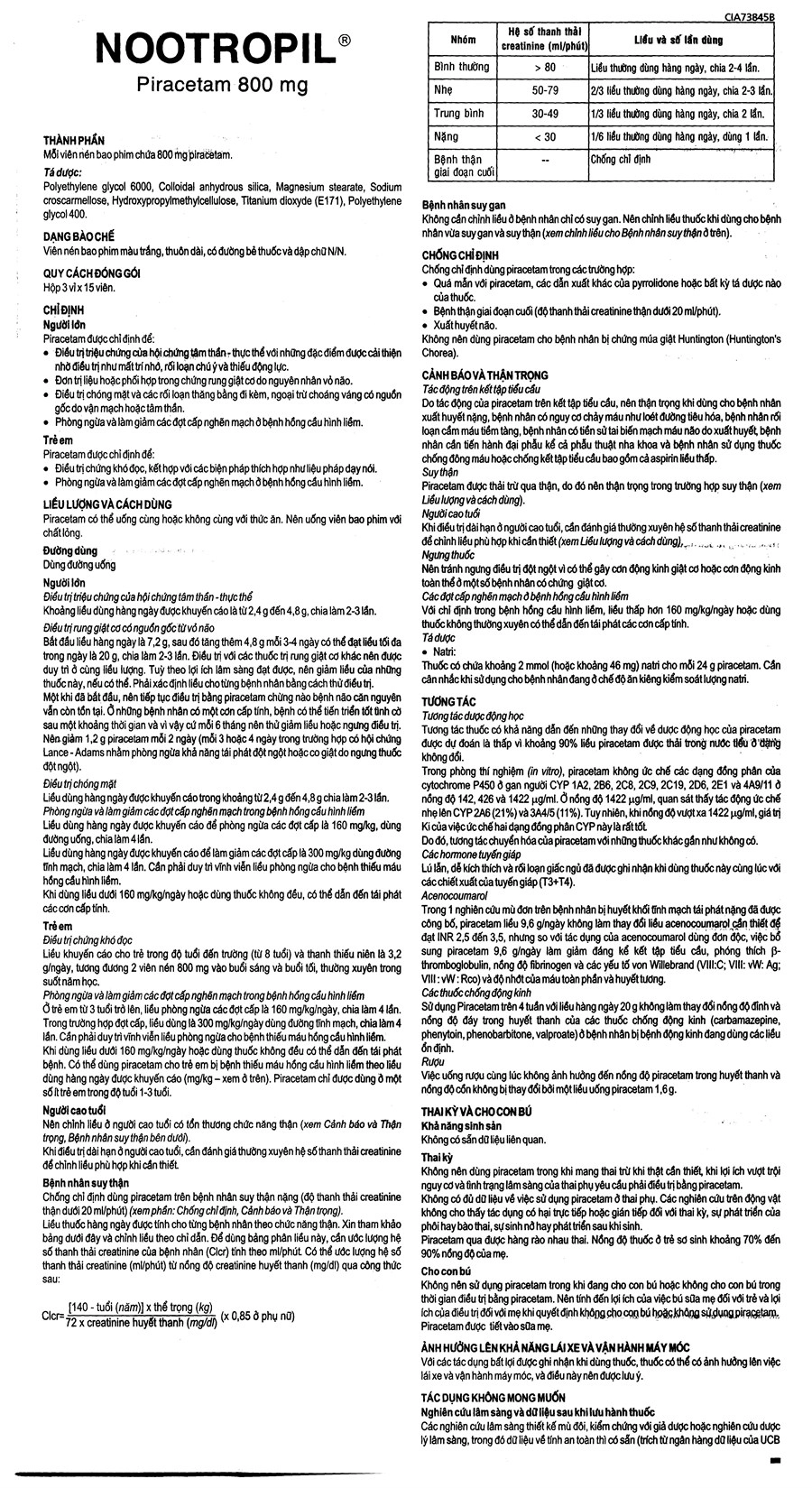 - Piracetam được thải trừ qua thận, do đó nên thận trọng trong trường hợp suy thận (xem Liều lượng và cách dùng).