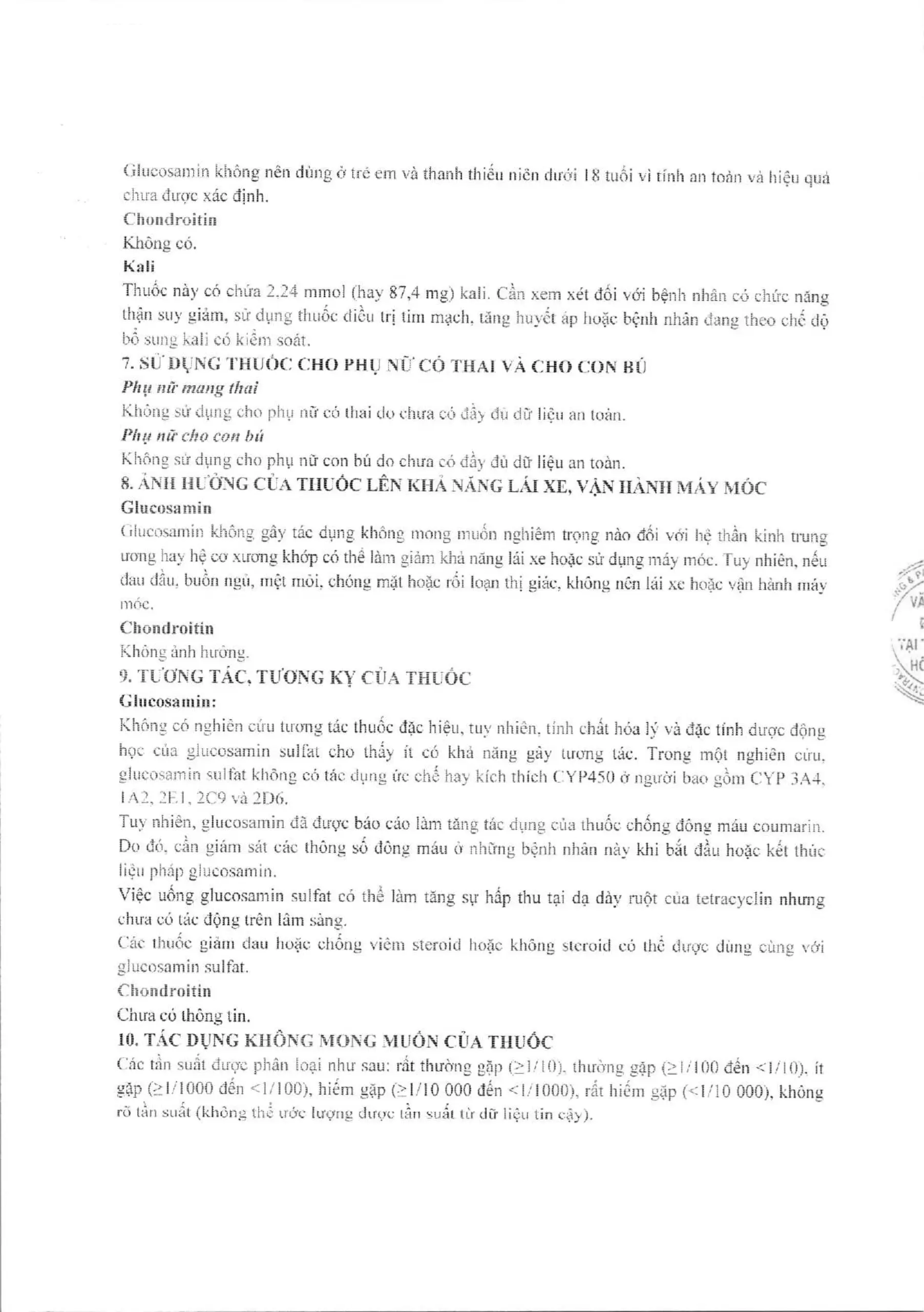 - Glucosamin sulfat không có tác dụng ức chế hay kích thích CYP450 ở người bao gồm CYP 3A4, 1A2, 2EI, 2C9 và 2D6, do đó, không có sự ảnh hưởng đến quá trình chuyển hóa khi dùng đồng thời với các thuốc chuyển hóa qua CYP450.