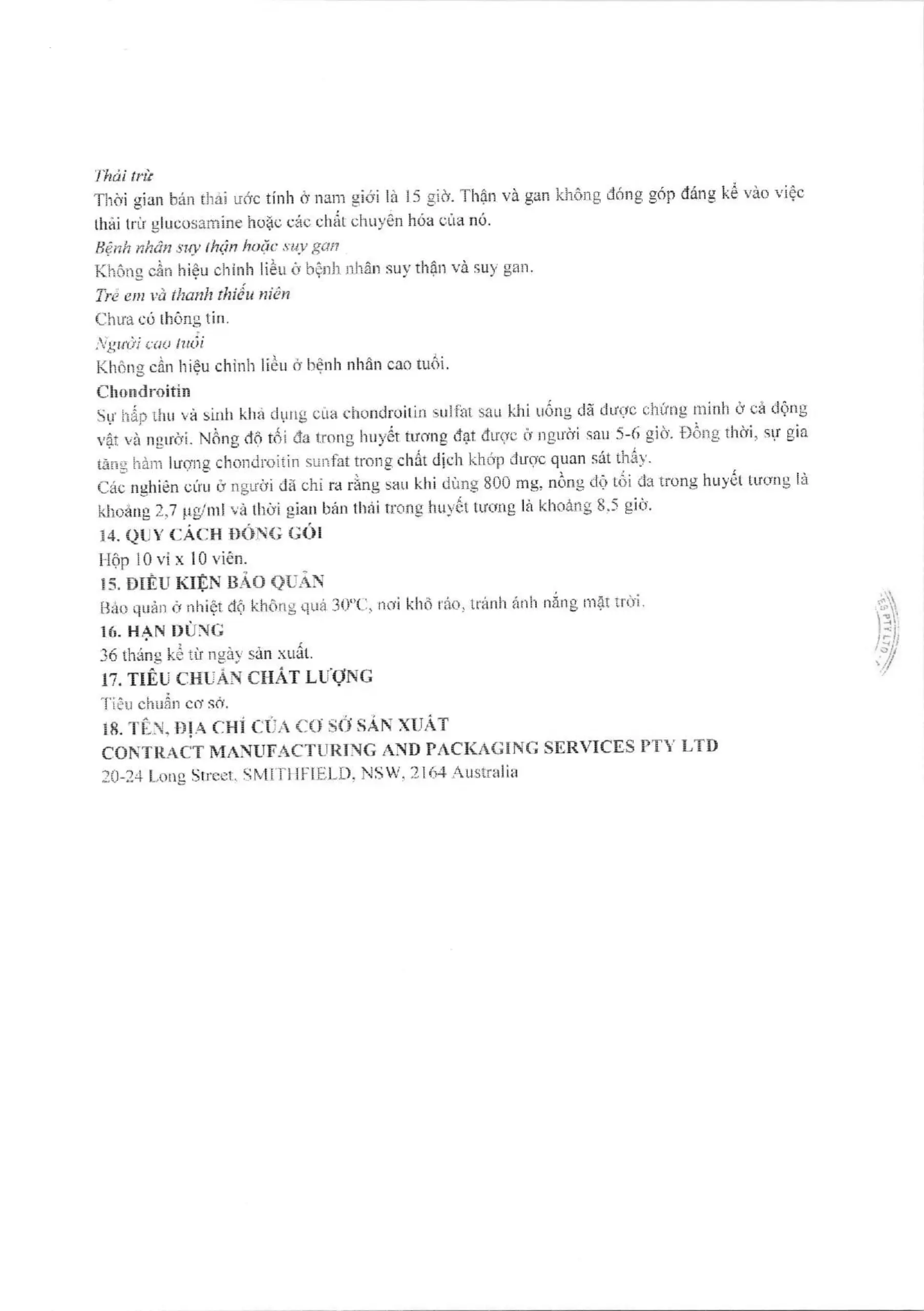 - Glucosamin hấp thu trên 90% qua đường uống ở người khỏe mạnh. Sau khi uống glucosamin sulfat 500mg mỗi ngày ở người tình nguyện khỏe mạnh khi đói, nồng độ tối đa trong huyết tương ở trạng thái ổn định là 1602 ± 426 ng/ml sau 1,5-4 giờ. Chưa đánh giá ảnh hưởng của thức ăn tới sự hấp thu thuốc. Chưa thấy sự khác biệt về dược động học giữa hai giới, giữa người tình nguyện khỏe mạnh với người mắc thoái hóa khớp gối.