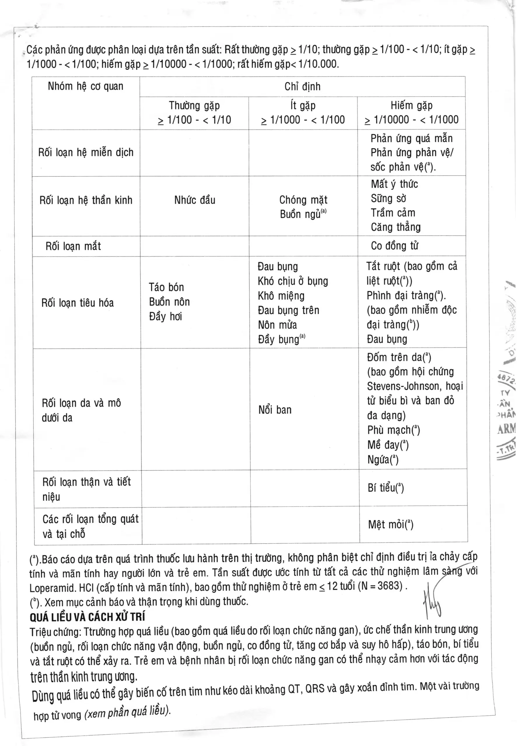 (a).Báo cáo dựa trên quá trình thuốc lưu hành trên thị trường, không phân biệt chỉ định điều trị ỉa chảy cấp tính và mãn tính hay người lớn và trẻ em. Tần suất được ước tính từ tất cả các thử nghiệm lâm sàng với Loperamid. HCl (cấp tính và mãn tính), bao gồm thử nghiệm ở trẻ em < 12 tuổi (N = 3683) .