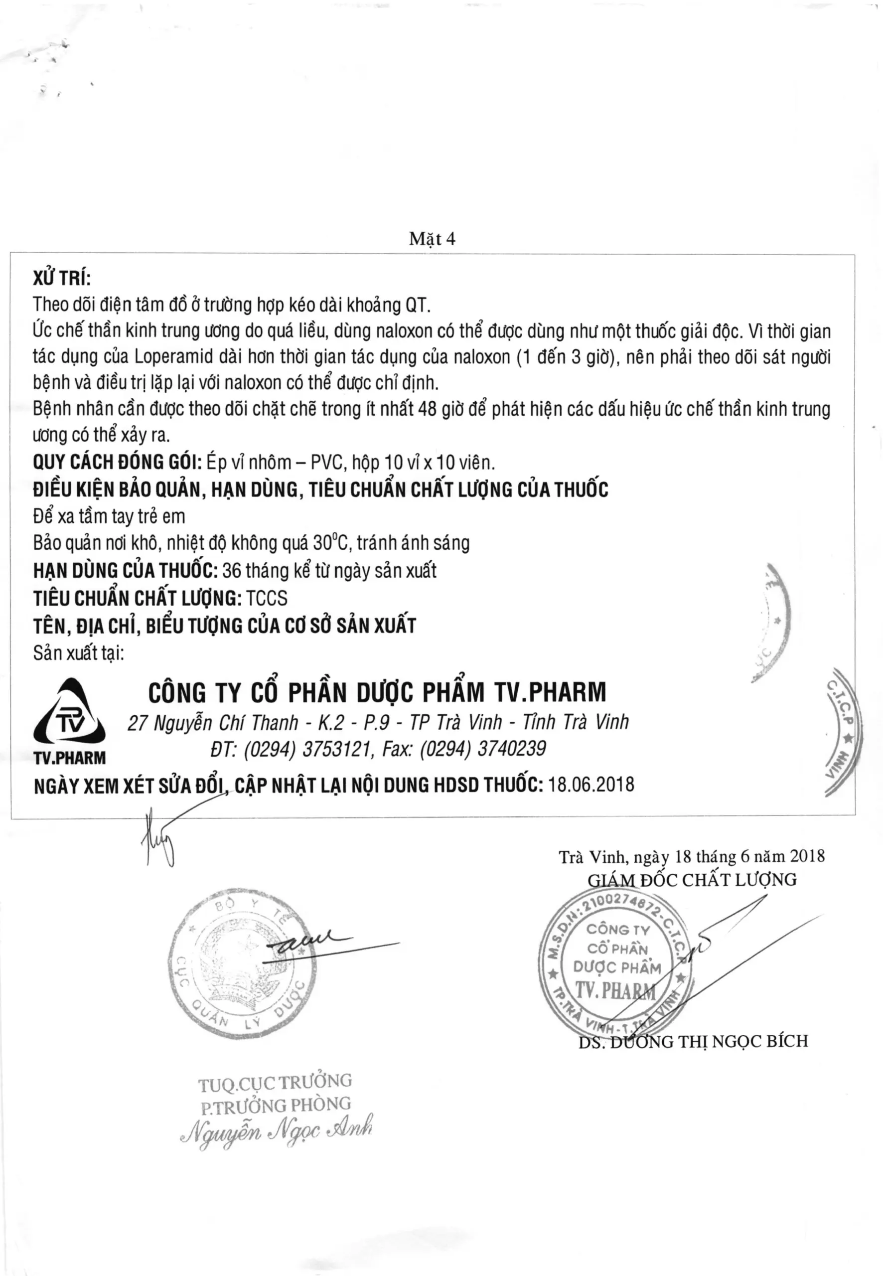 - Ức chế thần kinh trung ương do quá liều, dùng naloxon có thể được dùng như một thuốc giải độc. Vì thời gian tác dụng của Loperamid dài hơn thời gian tác dụng của naloxon (1 đến 3 giờ), nên phải theo dõi sát người bệnh và điều trị lặp lại với naloxon có thể được chỉ định.