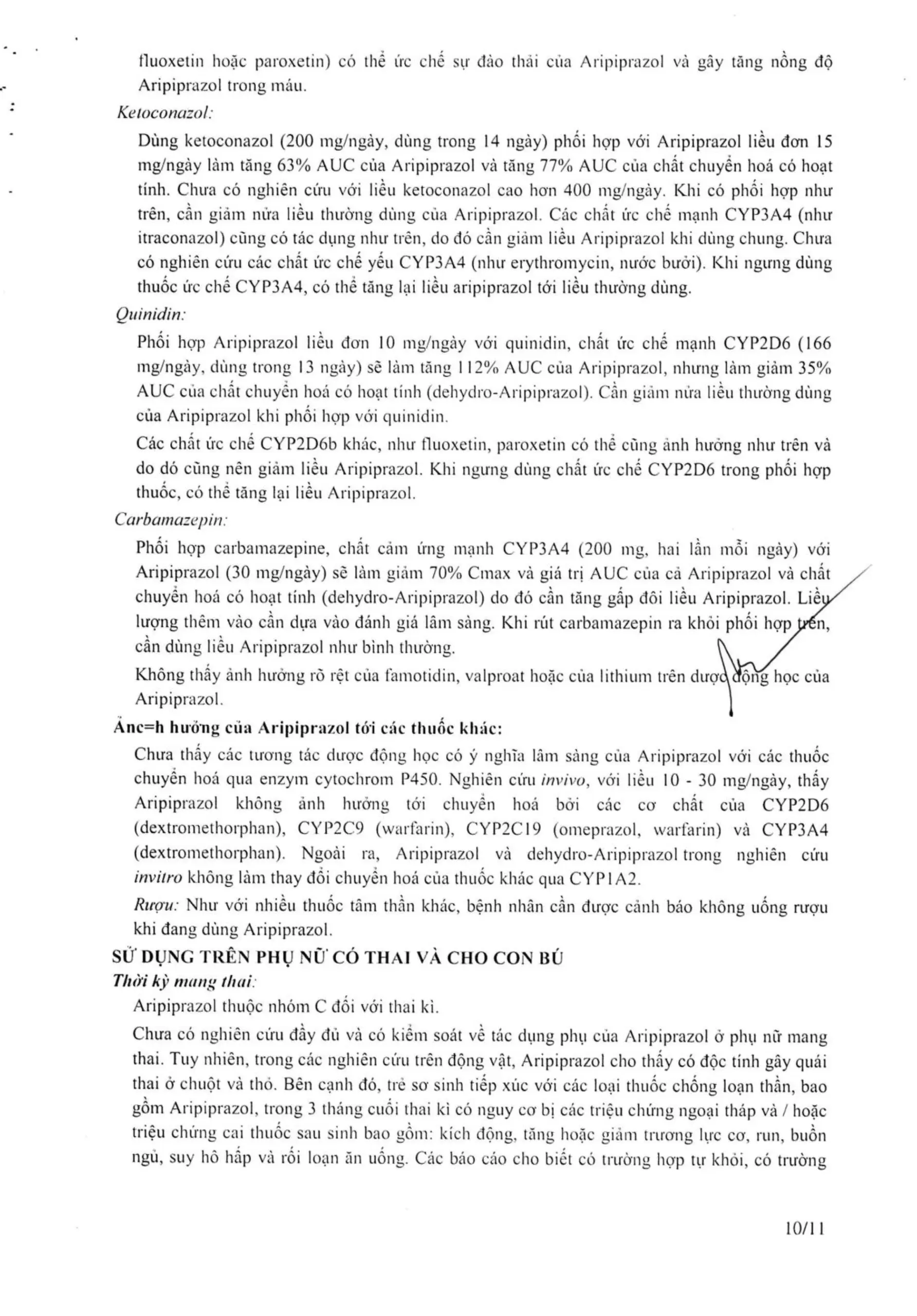 - Khi phối hợp Aripiprazol với chất ức chế CYP2D6 ví dụ khi phối hợp với quinidin, fluoxetin hoặc paroxetin, phải giảm liều Aripiprazol ít nhất xuống còn nửa liều thường dùng và tăng liều Aripiprazol trở lại khi ngưng chất ức chế CYP2D6.
