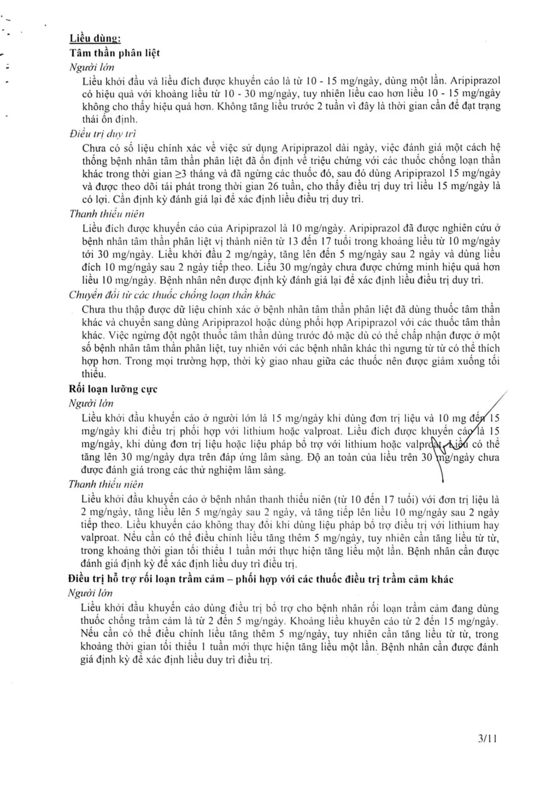 - Chưa có số liệu chính xác về việc sử dụng Aripiprazol dài ngày, việc đánh giá một cách hệ thống bệnh nhân tâm thần phân liệt đã ổn định về triệu chứng với các thuốc chống loạn thần khác trong thời gian ≥3 tháng và đã ngừng các thuốc đó, sau đó dùng Aripiprazol 15 mg/ngày và được theo dõi tái phát trong thời gian 26 tuần, cho thấy điều trị duy trì liều 15 mg/ngày là có lợi. Cần định kỳ đánh giá lại để xác định liều điều trị duy trì.