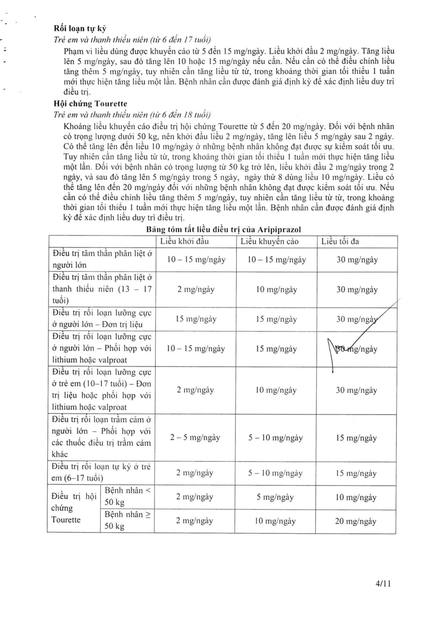 Bảng tóm tắt liều điều trị của Aripiprazol