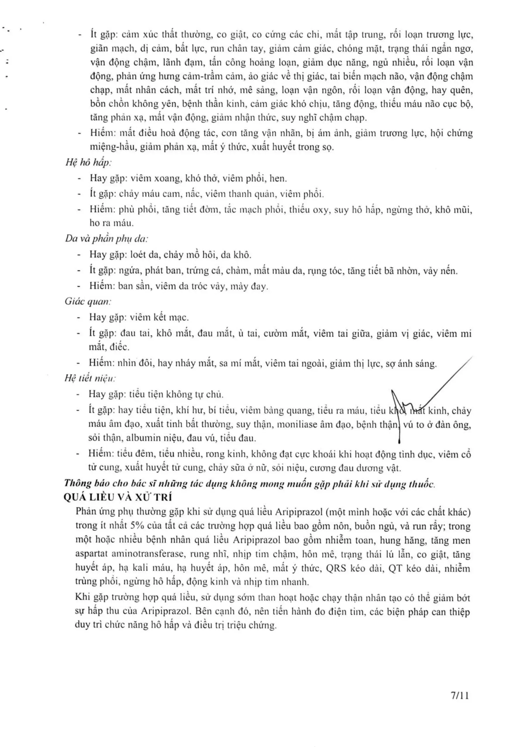 - Phản ứng phụ thường gặp khi sử dụng quá liều Aripiprazol (một mình hoặc với các chất khác) trong ít nhất 5% của tất cả các trường hợp quá liều bao gồm nôn, buồn ngủ, và run rẩy.