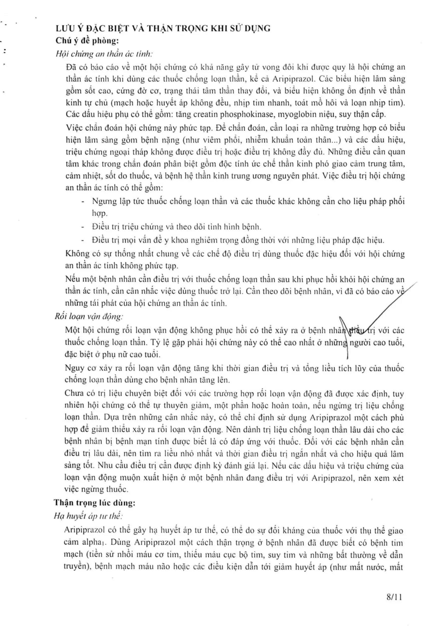 - Chưa thu thập được dữ liệu chính xác ở bệnh nhân tâm thần phân liệt đã dùng thuốc tâm thần khác và chuyển sang dùng Aripiprazol hoặc dùng phối hợp Aripiprazol với các thuốc tâm thần khác. Việc ngừng đột ngột thuốc tâm thần dùng trước đó mặc dù có thể chấp nhận được ở một số bệnh nhân tâm thần phân liệt, tuy nhiên với các bệnh nhân khác thì ngưng từ từ có thể thích hợp hơn. Trong mọi trường hợp, thời kỳ giao nhau giữa các thuốc nên được giảm xuống tối thiểu.