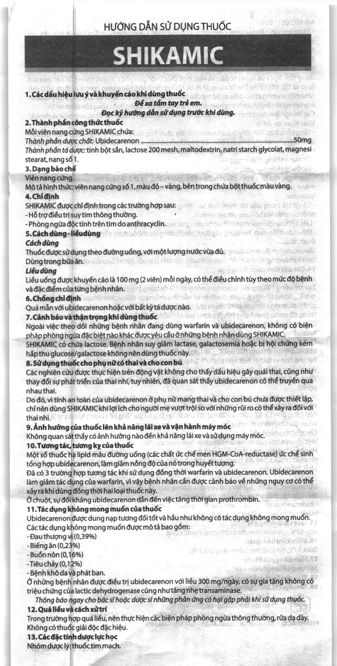 - Ngoài việc theo dõi những bệnh nhân đang dùng warfarin và ubidecarenon, không có biện pháp phòng ngừa đặc biệt nào khác được yêu cầu ở những bệnh nhân dùng SHIKAMIC.