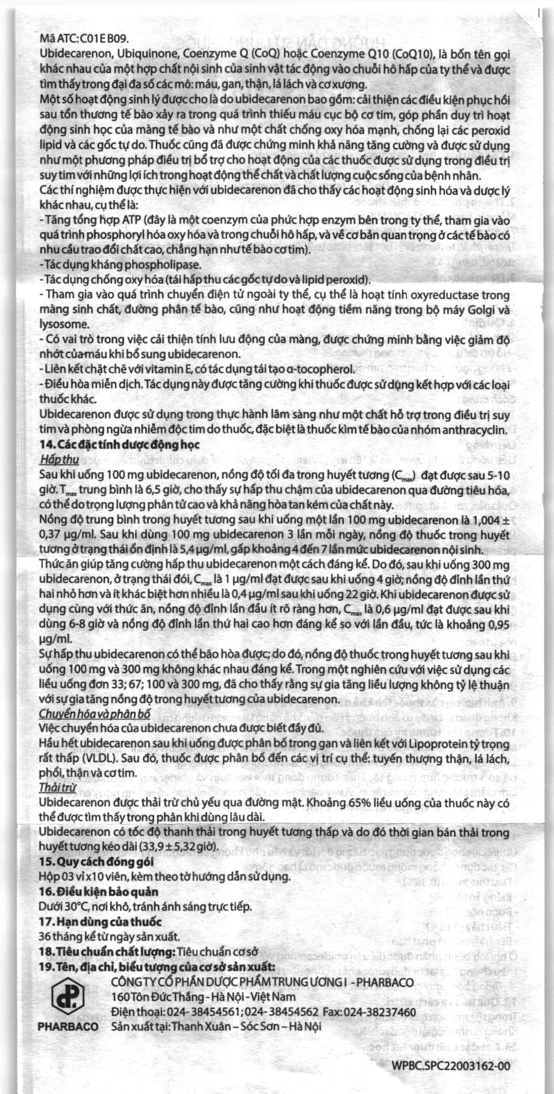 - Sự hấp thu ubidecarenon có thể bão hòa được; do đó, nồng độ thuốc trong huyết tương sau khi uống 100 mg và 300 mg không khác nhau đáng kể. Trong một nghiên cứu với việc sử dụng các liều uống đơn 33; 67; 100 và 300 mg, đã cho thấy rằng sự gia tăng liều lượng không tỷ lệ thuận với sự gia tăng nồng độ trong huyết tương của ubidecarenon.