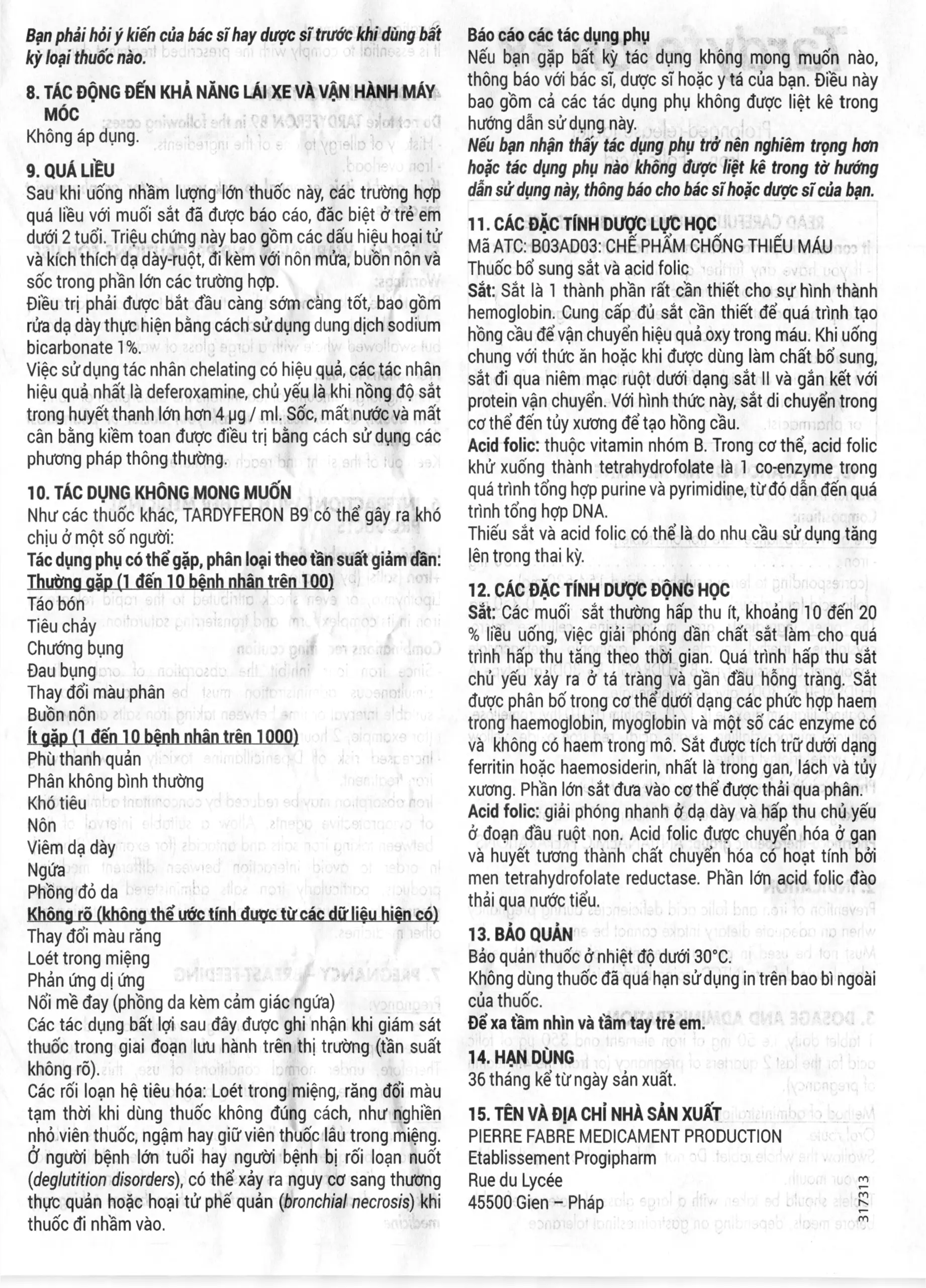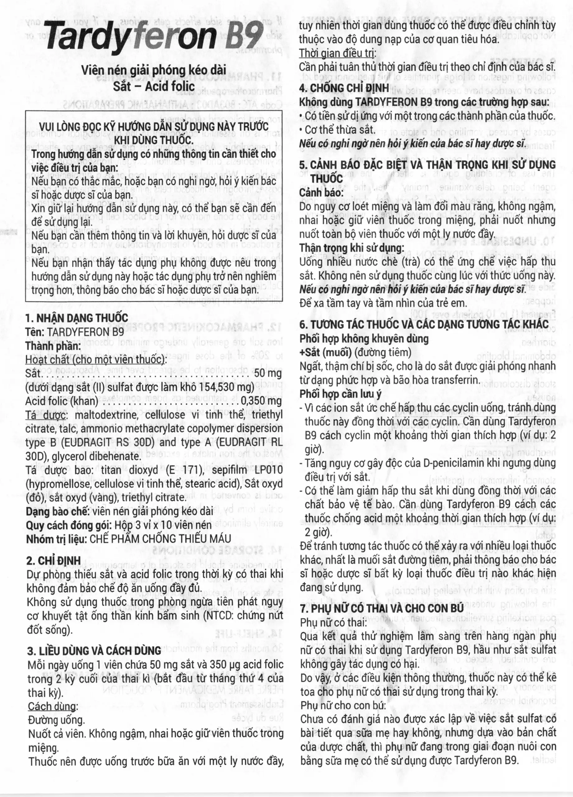 - Qua kết quả thử nghiệm lâm sàng trên hàng ngàn phụ nữ có thai khi sử dụng Tardyferon B9, hầu như sắt sulfat không gây tác dụng có hại.