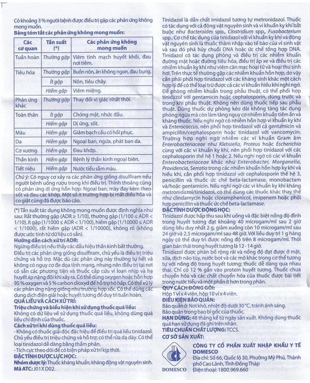 - Tinidazol được phân bố rộng rãi và nồng độ đạt được ở mật, sữa, dịch não tủy, nước bọt và các mô khác trong cơ thể tương tự với nồng độ trong huyết tương; thuốc dễ dàng qua nhau thai. Chỉ có 12% gắn vào protein huyết tương. Thuốc chưa chuyển hóa và các chất chuyển hóa của thuốc được bài tiết trong nước tiểu và một phần ít hơn trong phân.